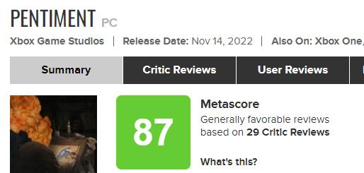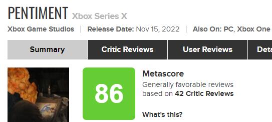 【《Pentiment》媒体评分出炉,IGN10分,GameSpot6分】由黑曜石打造的中世纪叙事悬疑新作《Pentiment》全球媒体评分已出炉,其中IGN为本作打出了10分,GameSpot打出6分。目前游戏XSX版的MC媒体均分为86分(42家媒体评价),PC版的MC媒体均分为87分(29家媒体评价)。