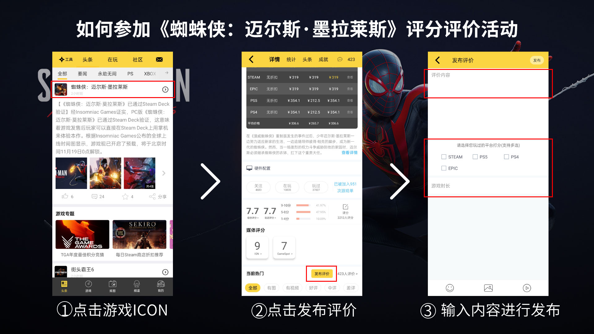 【给《蜘蛛侠:迈尔斯·墨拉莱斯》打分并评价抽2个PS5国行DualSense手柄】“蜘蛛侠”系列作品《蜘蛛侠:迈尔斯·墨拉莱斯》已登录Steam和Epic商店,你喜欢游戏中少年迈尔斯·墨拉莱斯保卫家园的冒险剧情吗?游戏中的光影效果、画面表现以及背景音乐是否让你感到满意?你对游戏的战斗表现、收集要素、以及开放世界设定又有什么想要评价的?欢迎大家在《蜘蛛侠:迈尔斯·墨拉莱斯》详情页写下自己的游玩体验,我们将从活动时间内所有同时完成新评分+发布新评价的玩家中抽取2名幸运玩家赠送PS5国行DualSense手柄(注:只有去游戏详情页写游戏评价才可参与活动,无意义评价会被清除)