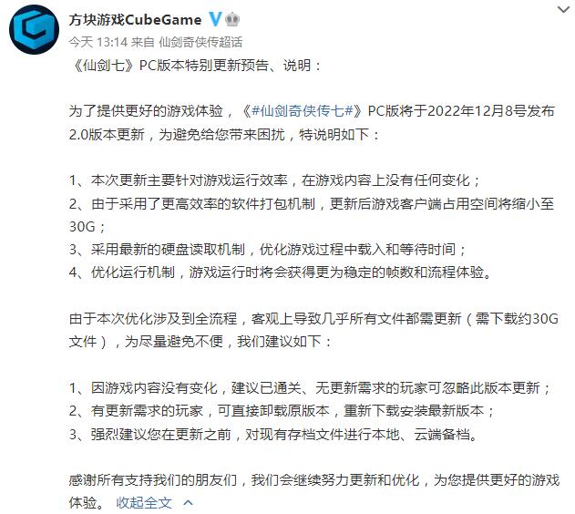 【《仙剑奇侠传7》PC版将发布更新,针对游戏运行效率进行优化】方块游戏官博今日宣布,《仙剑奇侠传7》PC版将于12月8日发布2.0版更新,更新内容如下:
