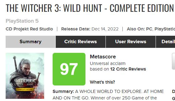 【《巫师3:狂猎》媒体评分出炉,MC媒体均分97分】《巫师3:狂猎》次世代版免费更新已于北京时间12月13日深夜24点上线PS5平台,12月14日早上8点登陆PC和XSX/S平台。目前本作PS5版的MC媒体均分为97分(12家媒体评价),VGC、Push Square等媒体认为即使在发售约七年后,《巫师3》仍然是一部杰作。游戏的角色刻画与对白至今尚未被超越,如此多引人入胜的叙事技巧仍然令人印象深刻。尽管其玩法的某些方面还没有那么成熟,但毫无疑问,次世代版是体验这款开放世界杰作的真正最佳版本。