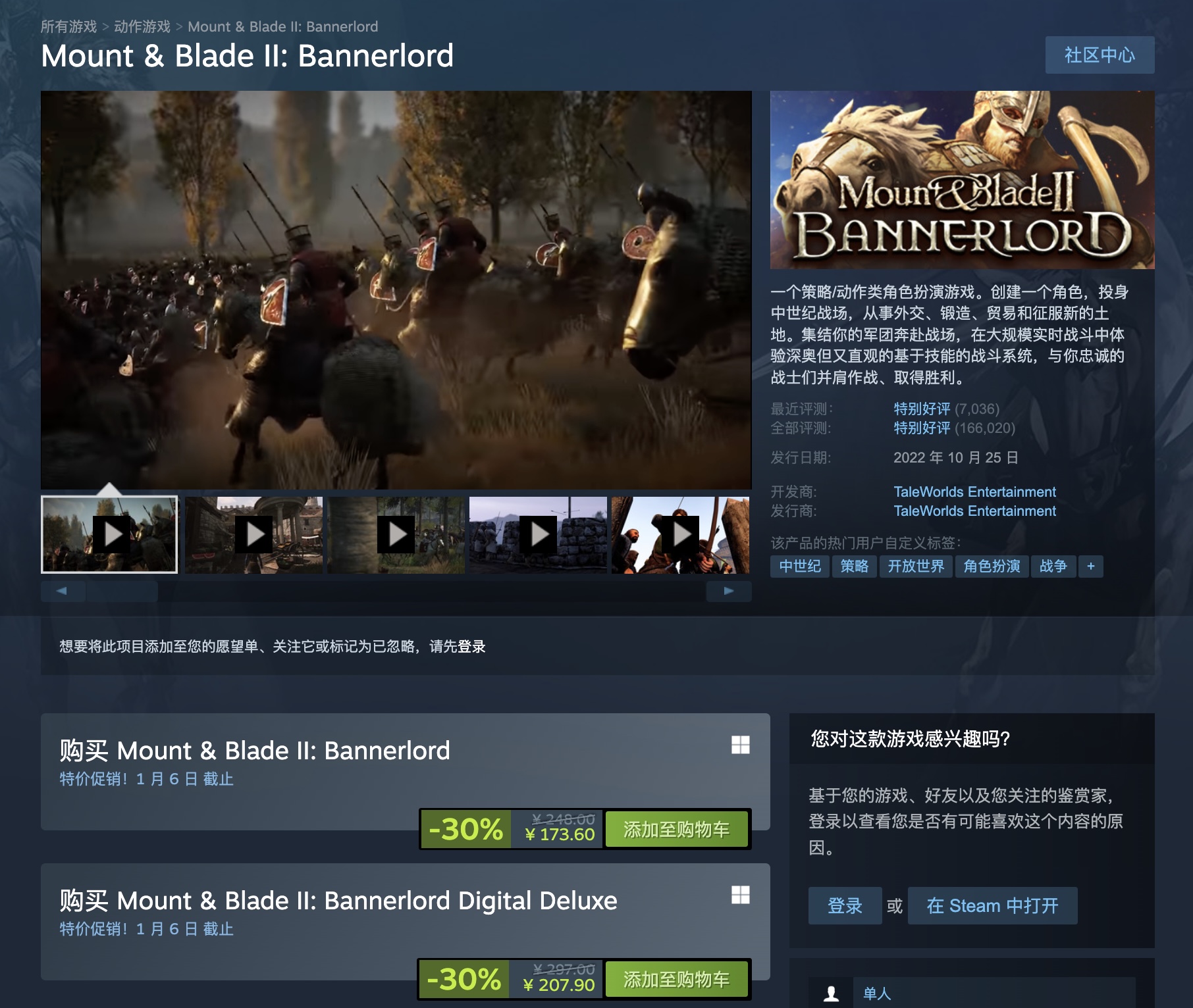 《骑马与砍杀2:领主》Steam新史低优惠,标准版173元