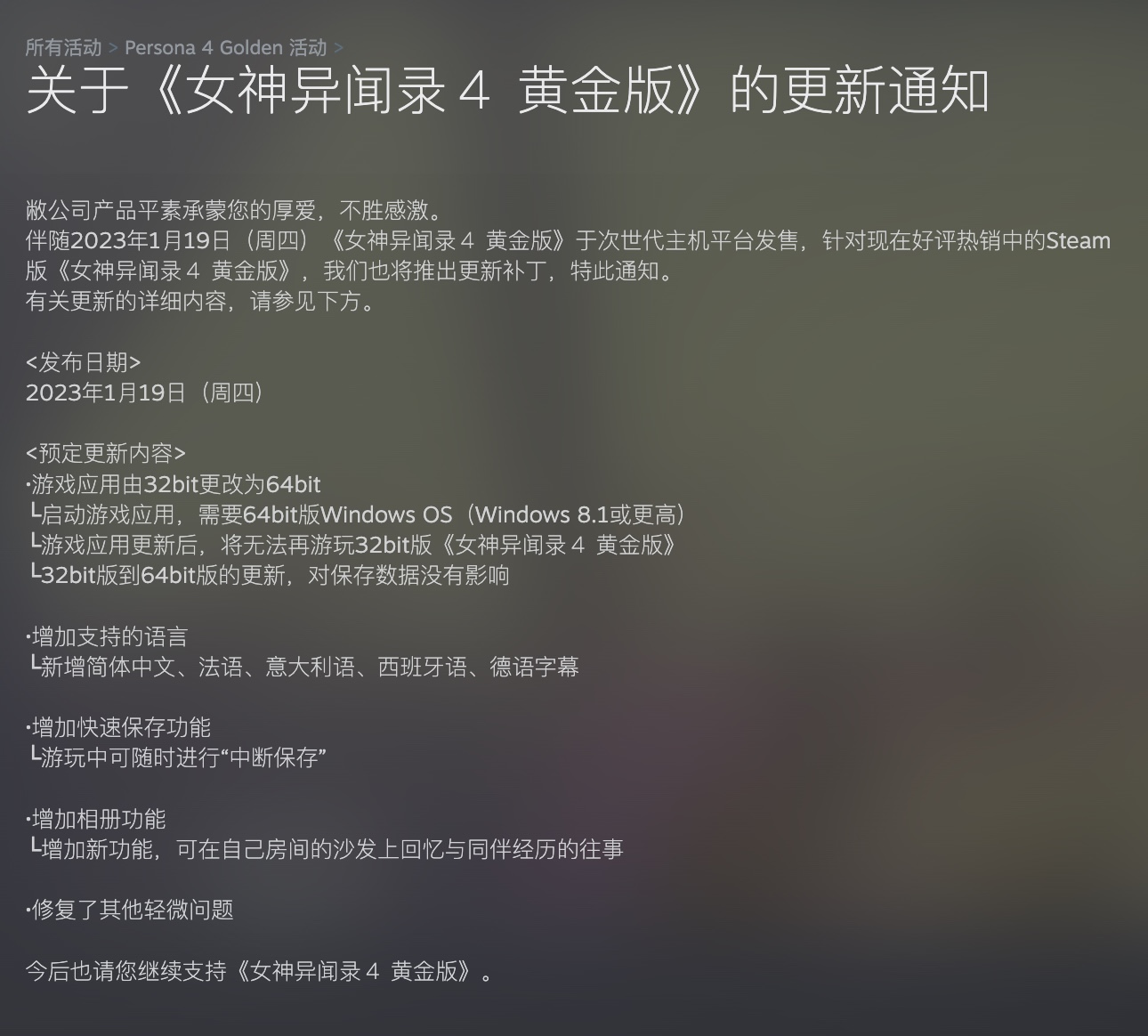 【《女神异闻录4 黄金版》将增加快速保存及相册功能,明年1月更新简体中文支持】ATLUS在Steam官方页面宣布《女神异闻录4 黄金版》将于2023年1月19日针对Steam版提供更新。届时将新增简体中文、法语、意大利语、西班牙语、德语支持。同时,游戏将由32位升级为64位,虽然不会对存档造成影响,但是如果玩家的操作系统不是64位,也将无法支持游戏。除了以上两个重大更新外,新版本还将提供快速保存功能及相册功能。