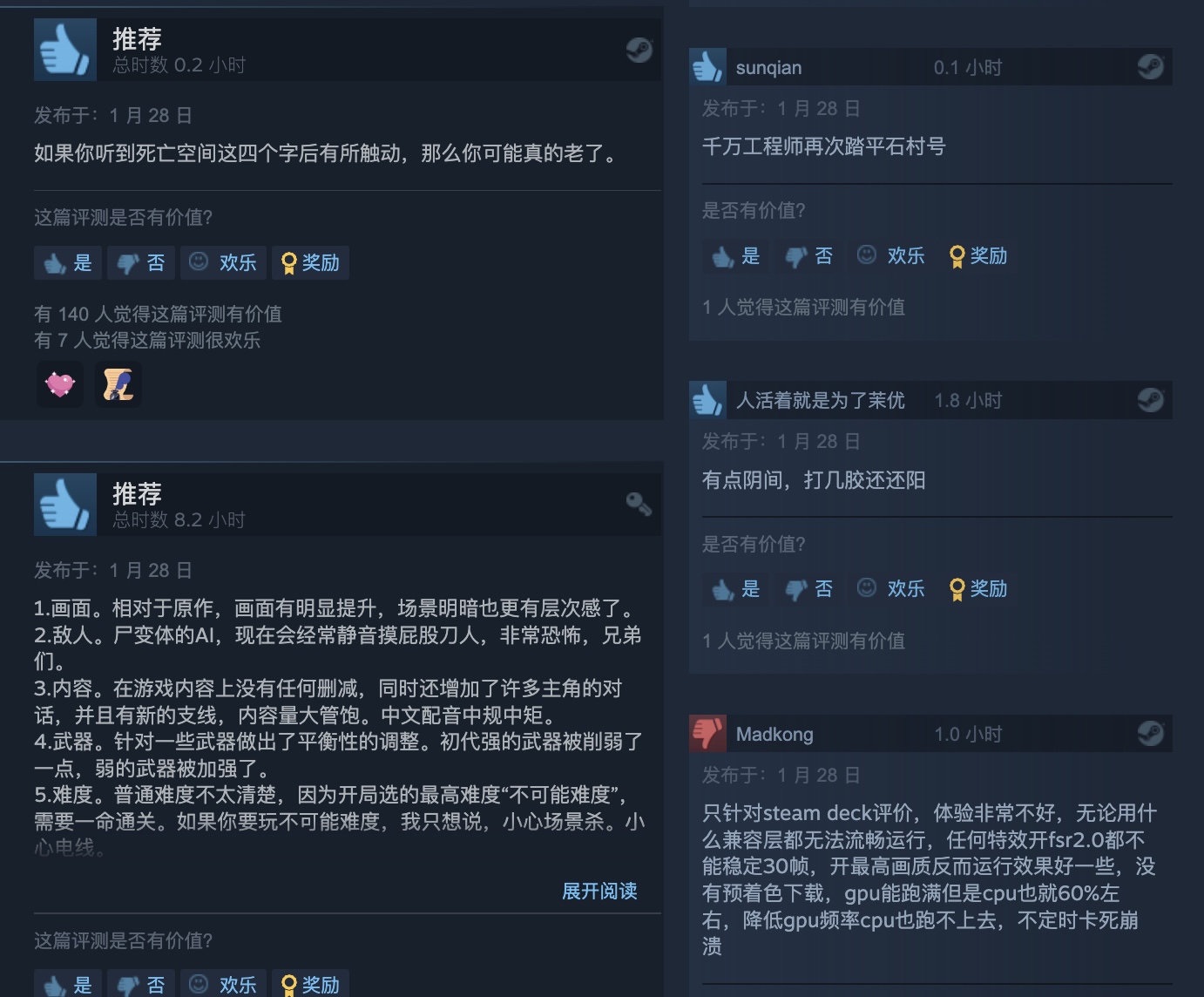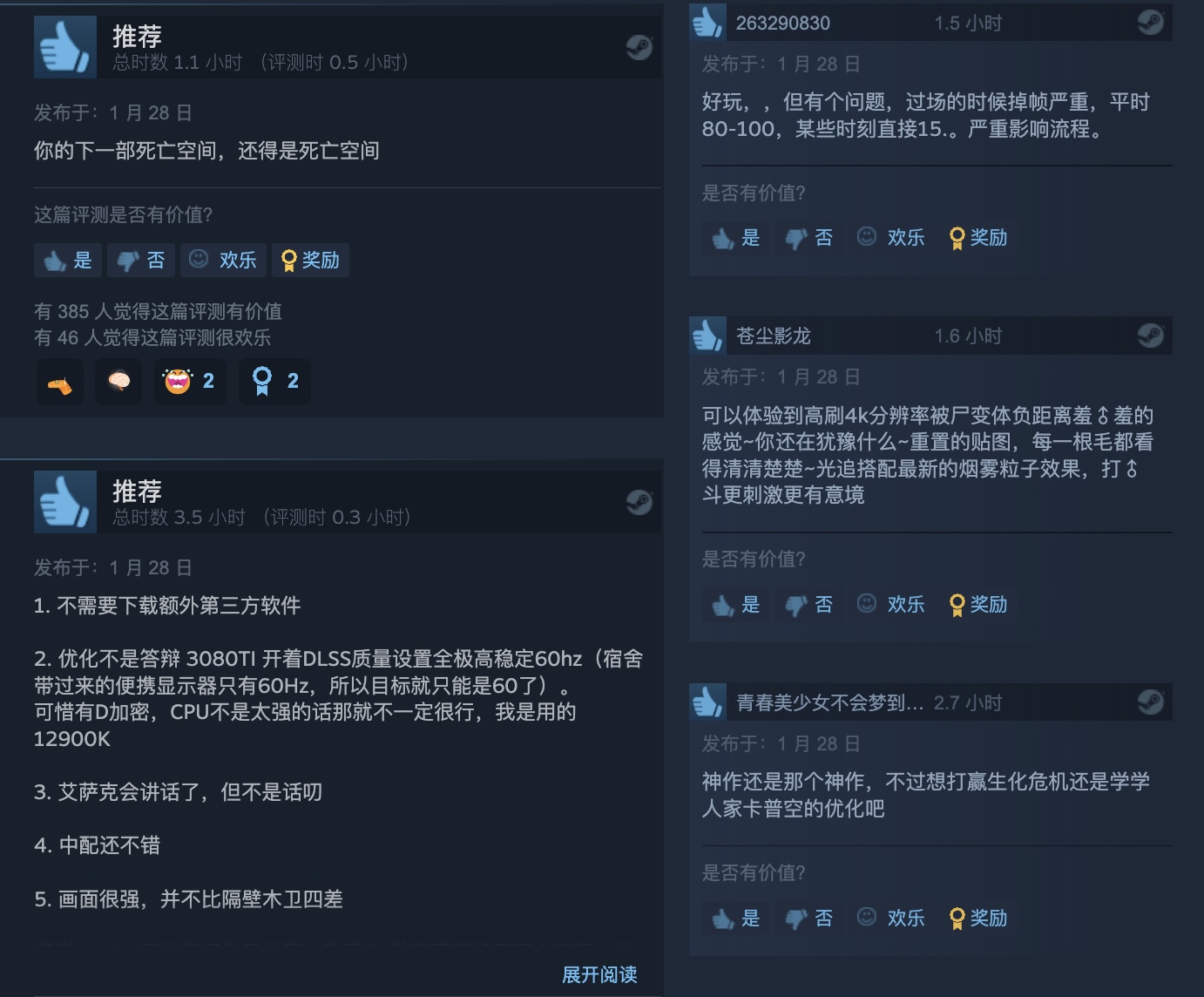 【《死亡空间:重制版》Steam“特别好评”】《死亡空间:重制版》已于今日正式发售,目前本作在Steam上已经收获超过2000篇评论,其中87%给予好评。给出好评的玩家认为本作中文配音给力,画面相比于原作有着非常明显的提升,游戏在原版的基础上增加了新的支线任务,内容量大管饱,很有诚意。但是,也有一些玩家表示游戏的优化尚有进步空间,在某些情况会出现比较严重的掉帧情况,希望官方可以进行修复。