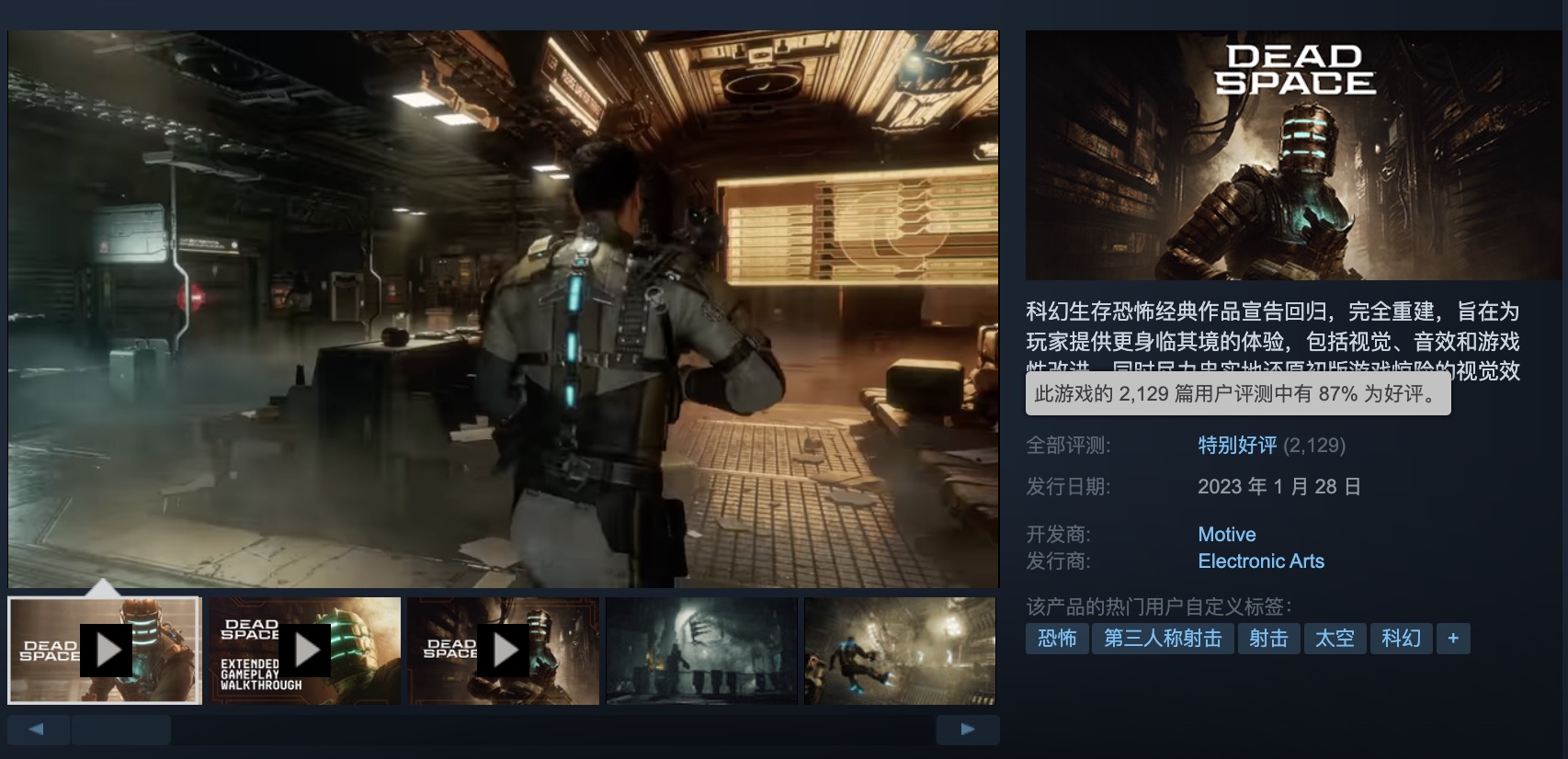 《死亡空间:重制版》Steam“特别好评”