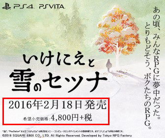 由Tokyo RPG Factory开发的PS4/PSV平台RPG游戏《祭祀与雪之刹那》发售日,根据今日流露出的网页广告显示《祭祀与雪之刹那》将于2016年2月18日发售,售价为4800日元。游戏中女主角“刹那”为了世界和平,决定牺牲自己成为祭祀之人换来世界的和平,而玩家将扮演刹那的佣兵,保护刹那直到她完成自己的使命。