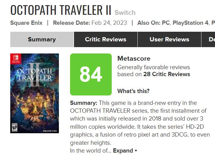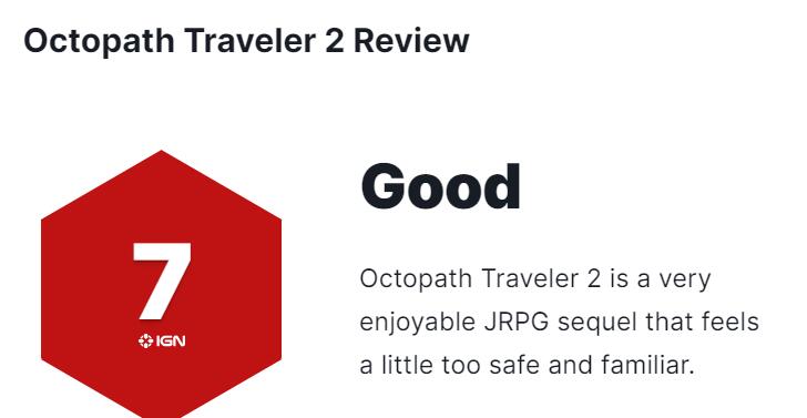 【《八方旅人2》获IGN 7分评价】《八方旅人2》评分已解禁,游戏目前在MC的媒体平均分为84(28家媒体),包括Game Informer 8.5分、Multiplayer it 8分、IGN 7分等。其中IGN认为本作对比前作战斗方式几乎没有改变,在前作成功的基础上,反而有些畏首畏尾,不敢大胆创新,画面上也没有太多惊喜。但总体来说战斗系统仍然比较有趣,玩家需要找出最佳行动方案来攻击敌人弱点,而在故事性上也比前作更有凝聚力。另外IGN还专门提到本作在Switch上的优化并不算好,存在画质降级、卡死等情况出现。