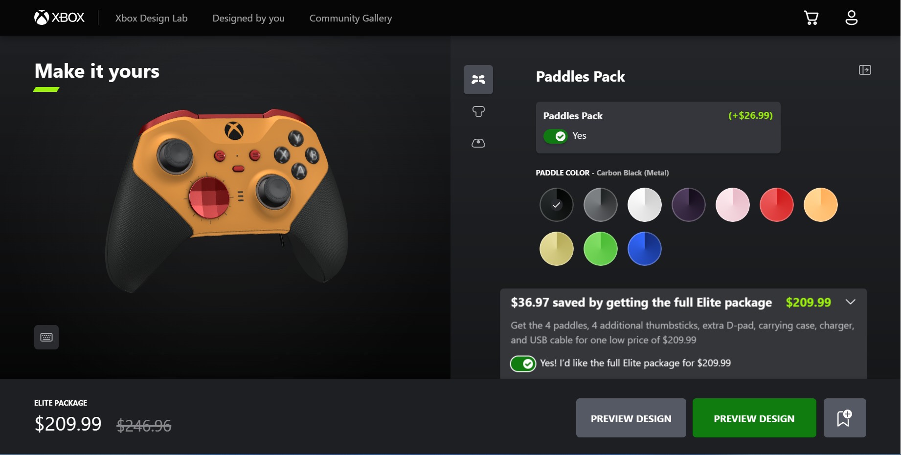 【《狂野之心》官方分享游戏主题创意配色手柄】今日,《狂野之心》官方分享了两款以该游戏为主题配色的Xbox手柄。该定制配色可在Xbox Design Lab进行选购。其中精英版本采用红黑黄配色,售价209.99美元,标准版采用蓝白绿配色,售价77.97美元。