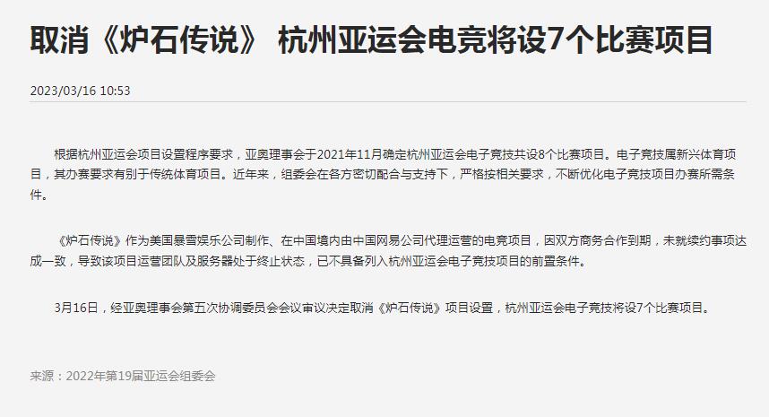 【杭州亚运会官方宣布取消《炉石传说》电竞项目】杭州2022年第19届亚运会官网今日发布公告,确认取消《炉石传说》项目设置。公告中表示,《炉石传说》因暴雪娱乐与网易商务合作到期,未就续约事项达成一致,导致该项目运营团队及服务器处于终止状态,已不具备列入杭州亚运会电子竞技项目的前置条件。完整公告见以下图片。