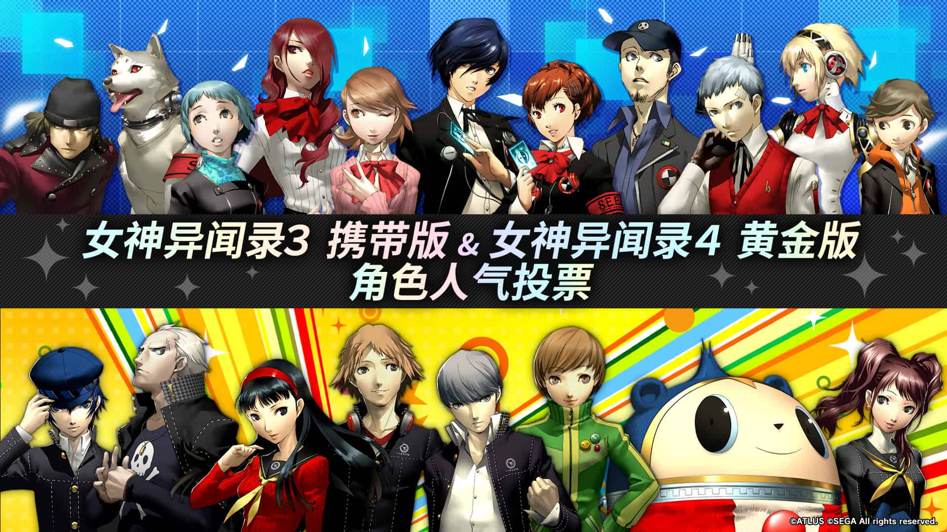 【《女神异闻录4:黄金版》角色人气排名公布】Atlus官博近日公布了《女神异闻录4:黄金版》角色人气投票排行榜,其中主角成功获得第一位,在其后面的依次为:花村阳介、久慈川理世、白钟直斗、天城雪子、小熊、里中千枝、巽完二。为了方便大家观看,这里一起附上中文官方之前所公布的《女神异闻录3:携带版》和《女神异闻录5:皇家版》复刻移植版的人气角色投票排名(Atlus于今年3月和去年12月时通过玩家投票选出)。