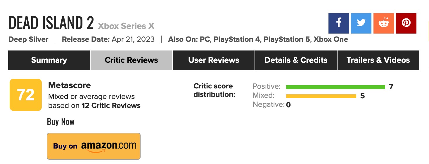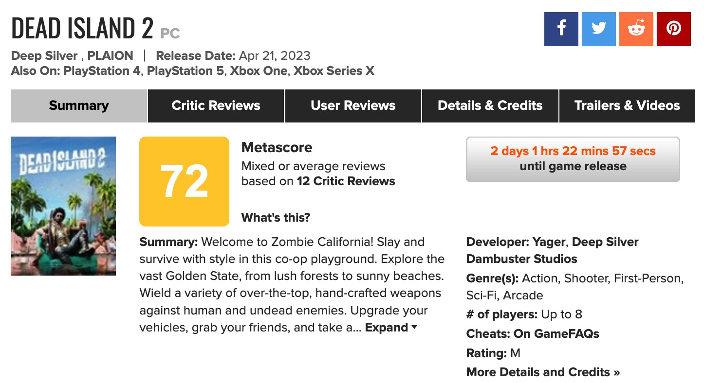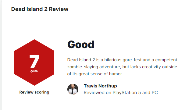 【《死亡岛2》获IGN/GS双7分】《死亡岛2》评分已在全球媒体解禁,其中IGN和GS双双给出7分。而在M站PS5版获得12家媒体75均分,Xbox Series X获得72分,PC版12家媒体给出72均分。