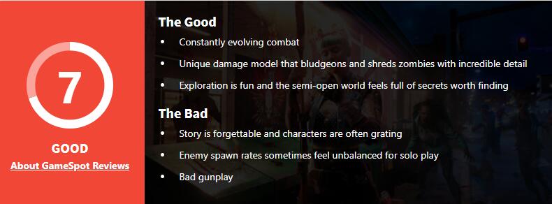 Gamespot则认为本作不断进化的战斗颇具趣味,僵尸受到攻击后细节的表现令人震撼。丰富的隐藏要素也使得这个半开放式世界非常值得探索。不过游戏的故事实在淡而无味,很容易玩过后就忘掉。单人游戏时敌人的生成率让人感觉不是很平衡。此外,游戏到了三分之一后才出现枪类武器,虽然种类还算多但是手感并不好。