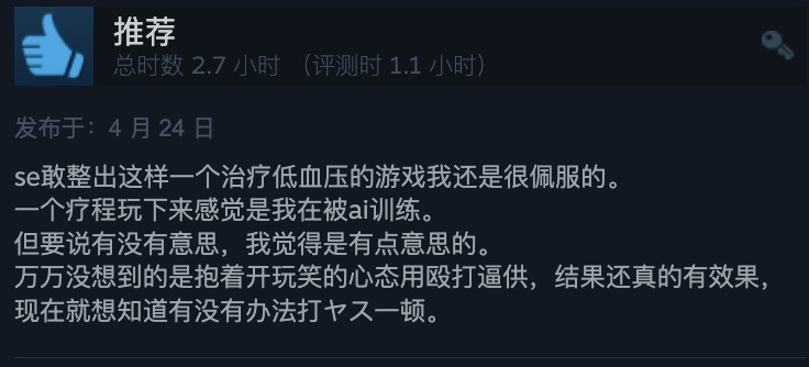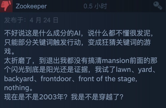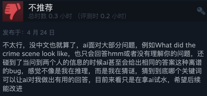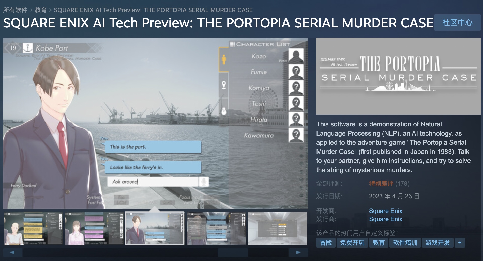 【SE搭载AI技术的新作《港口镇连续杀人事件》获Steam“特别差评”】Square Enix人工智能部的新冒险游戏《港口镇连续杀人事件》,作为自然语言处理人工智能AI技术的教育演示在近日上线了Steam。不过目前游戏的171篇评论中仅有10%好评,整体评价特别差评。玩家认为该作所谓的“AI”根本没有理解自然语言的能力,所谓的问答全部依靠一些关键字来触发回答,导致经常出现答非所问的情况。体验上甚至还不如古早的MUD依靠输入指令的游戏。不过也有一些玩家认为Square Enix能有勇气做出一款涉及AI的游戏还是有一些勇气的,如果抱着开玩笑的心态玩的话,也挺解压和放松的。