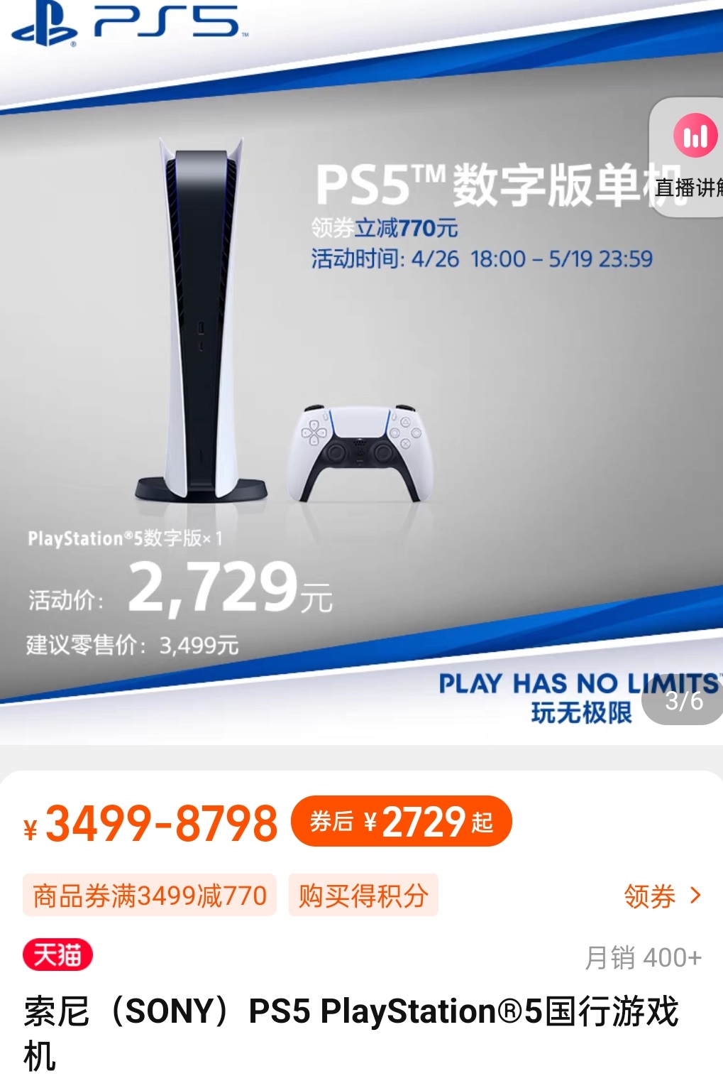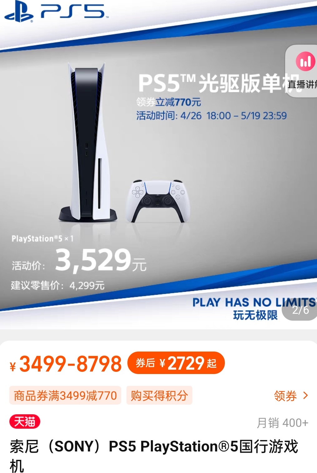 PS国行官方店开启优惠,PS5光驱版券后价3529元、数字版券后2729元