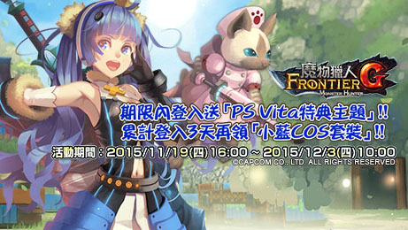 Playstation台湾日前与《怪物猎人:边境G》开展联合活动,11月19日维修后至12月3日维修前,只要登入游戏就能获得“PSV版合作特制主题”奖励领取资格。主题特典预计于2015/12月下旬发送。符合资格者届时将会从PS V系统讯息中收到“特典主题兑换代码”,请玩家于PS Store中输入代码,即可进行主题下载。