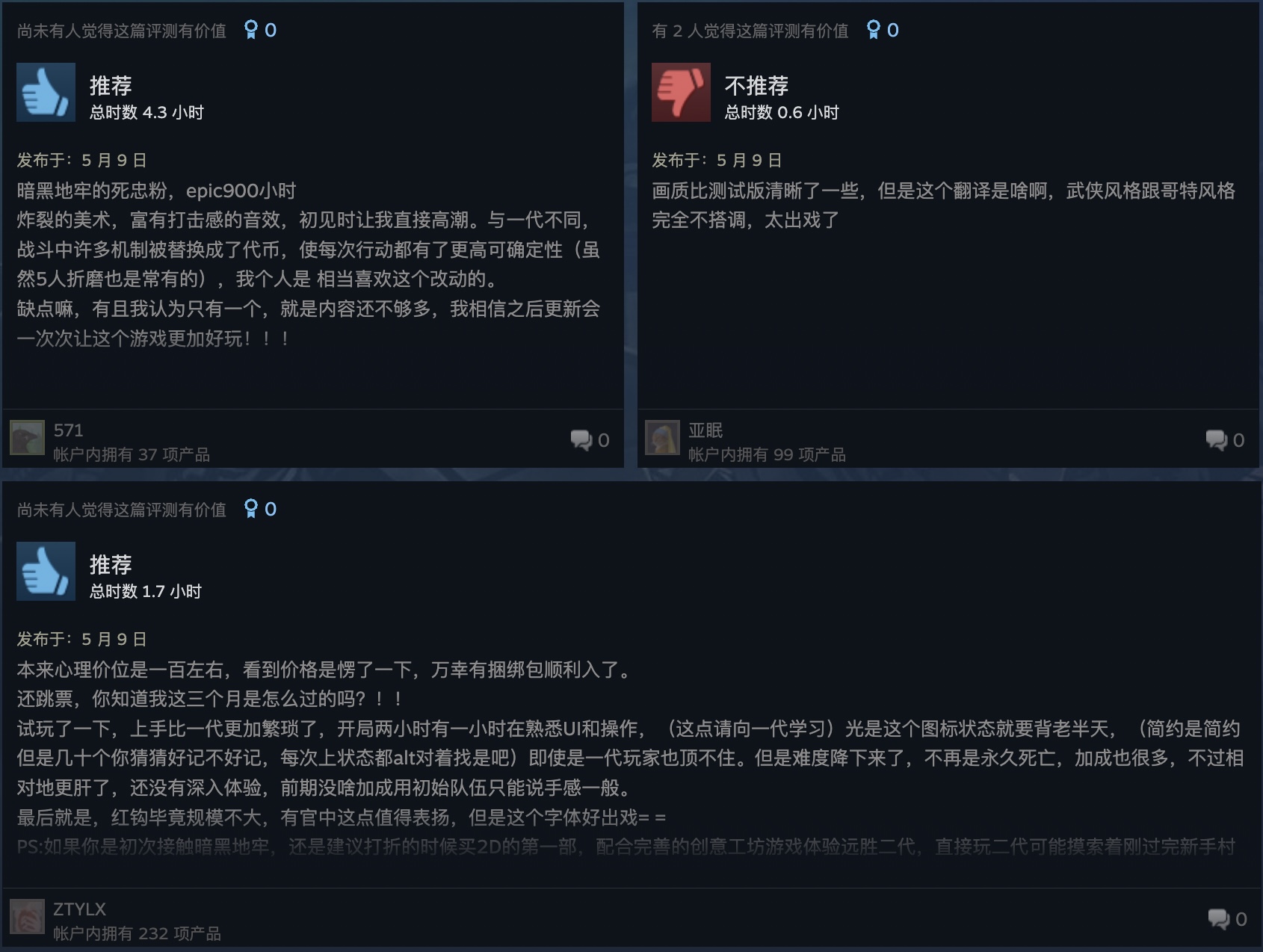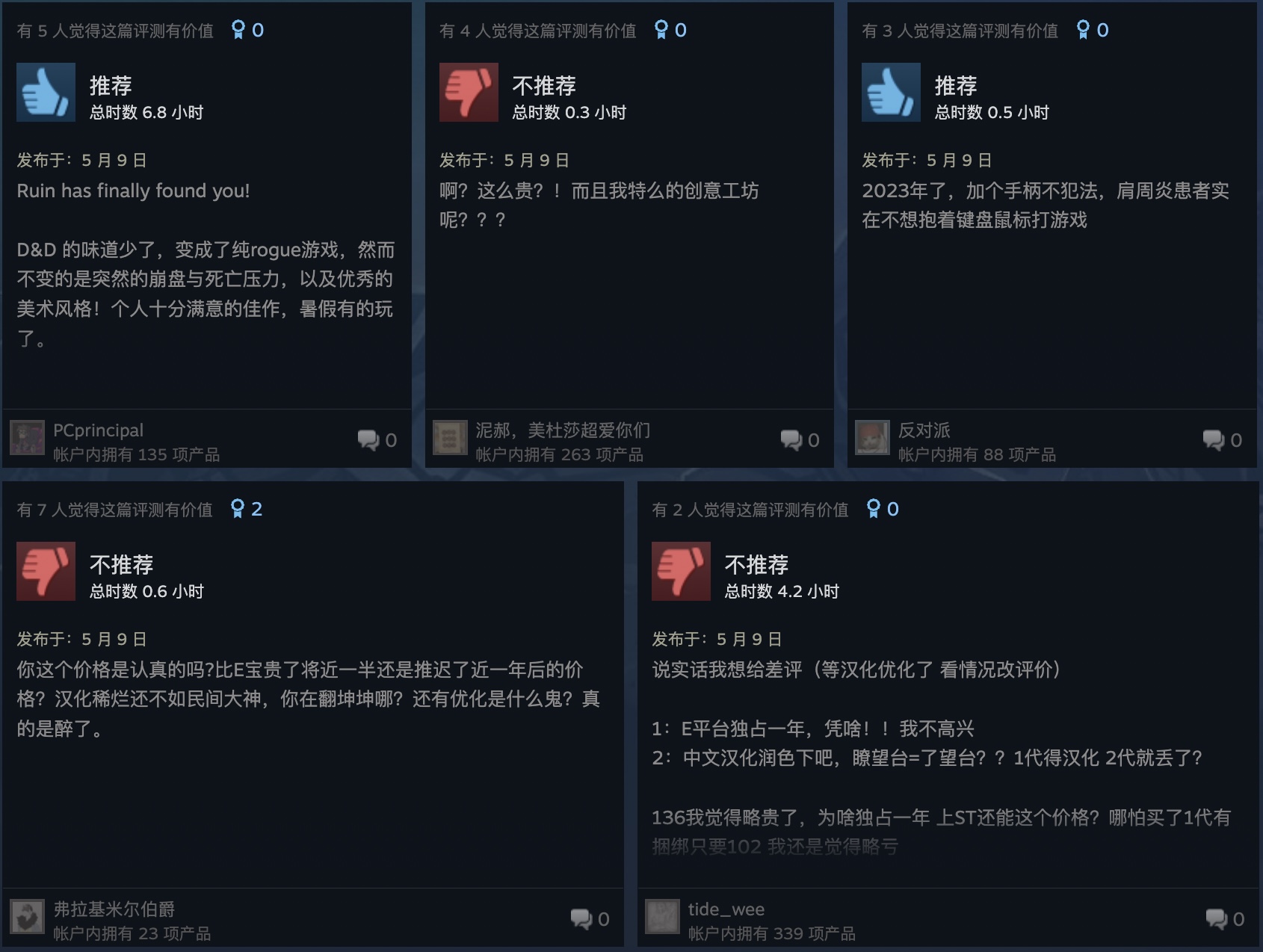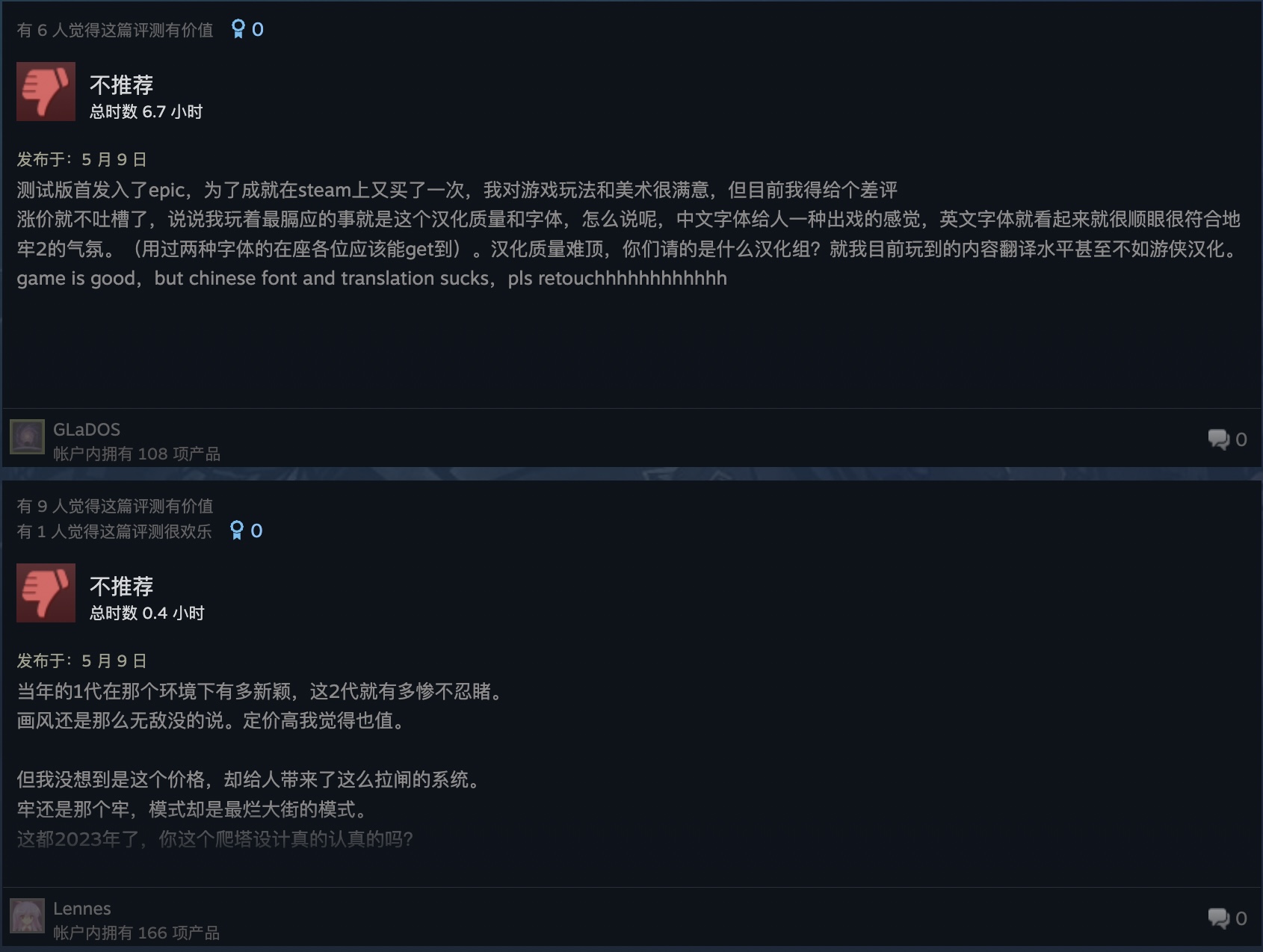 而本作的评论区也不缺乏一些批评的声音,比如一些玩家觉得和之前Epic平台的售价相比,Steam首发136元的价格显得比较昂贵。美德系统被砍等等,游戏的体验偏向爬塔。同时也有很多玩家吐槽本作汉化的水平拙劣,质量不高,同时汉化的字体也有些出戏。此外,还有很多玩家在进入游戏之后遇到崩溃和卡顿掉帧的问题,游戏的优化也有待进一步改进。目前游戏的创意工坊尚未开放。