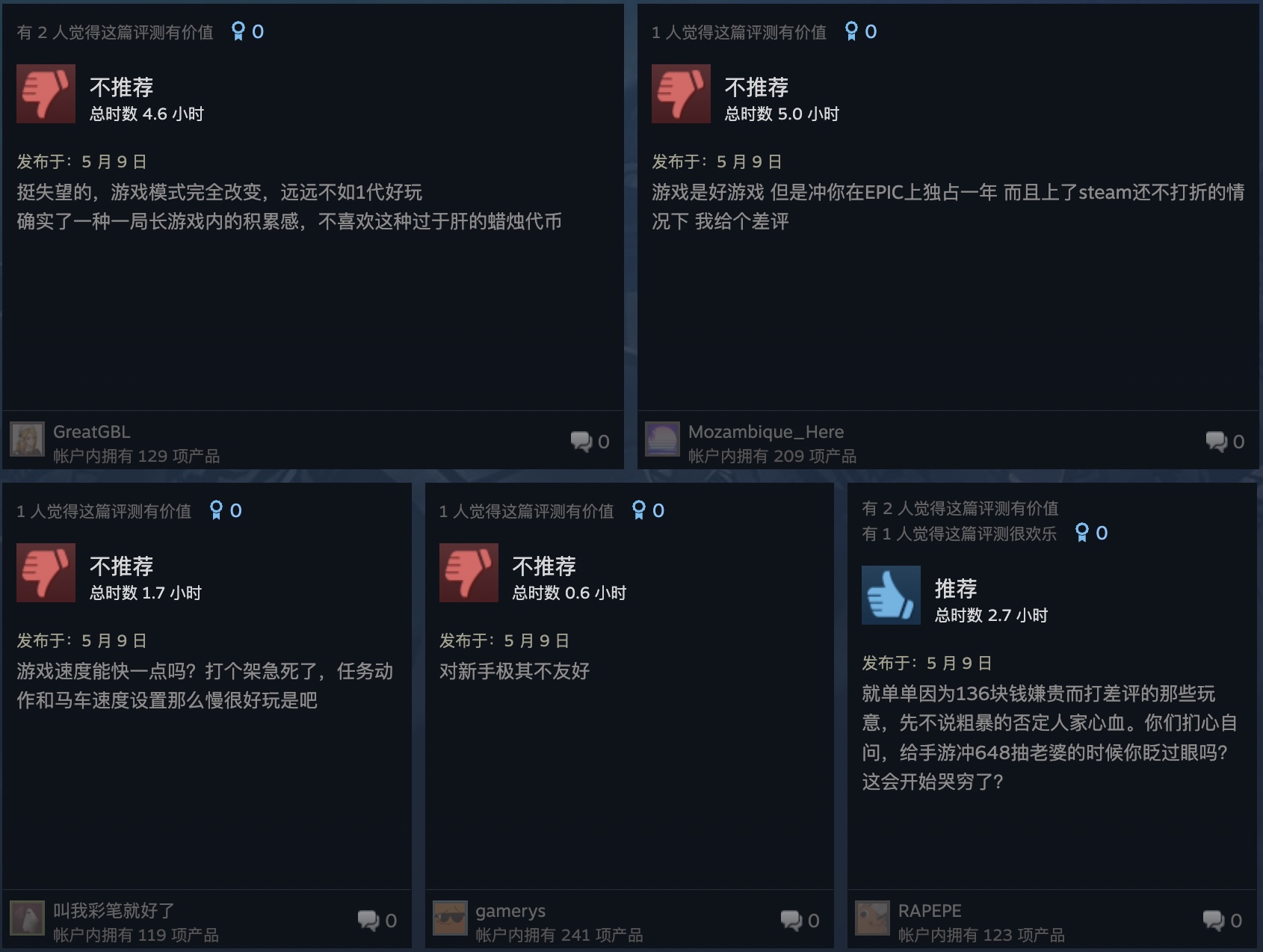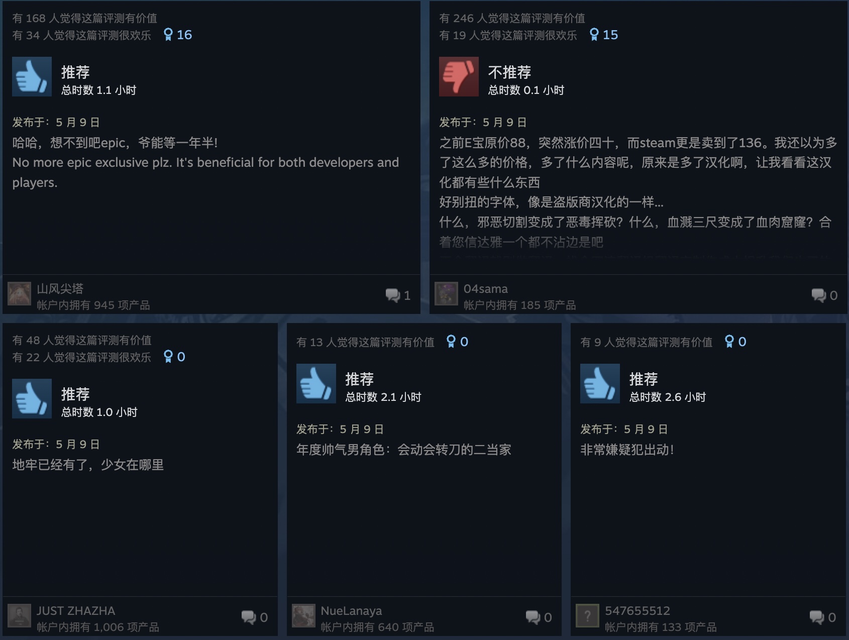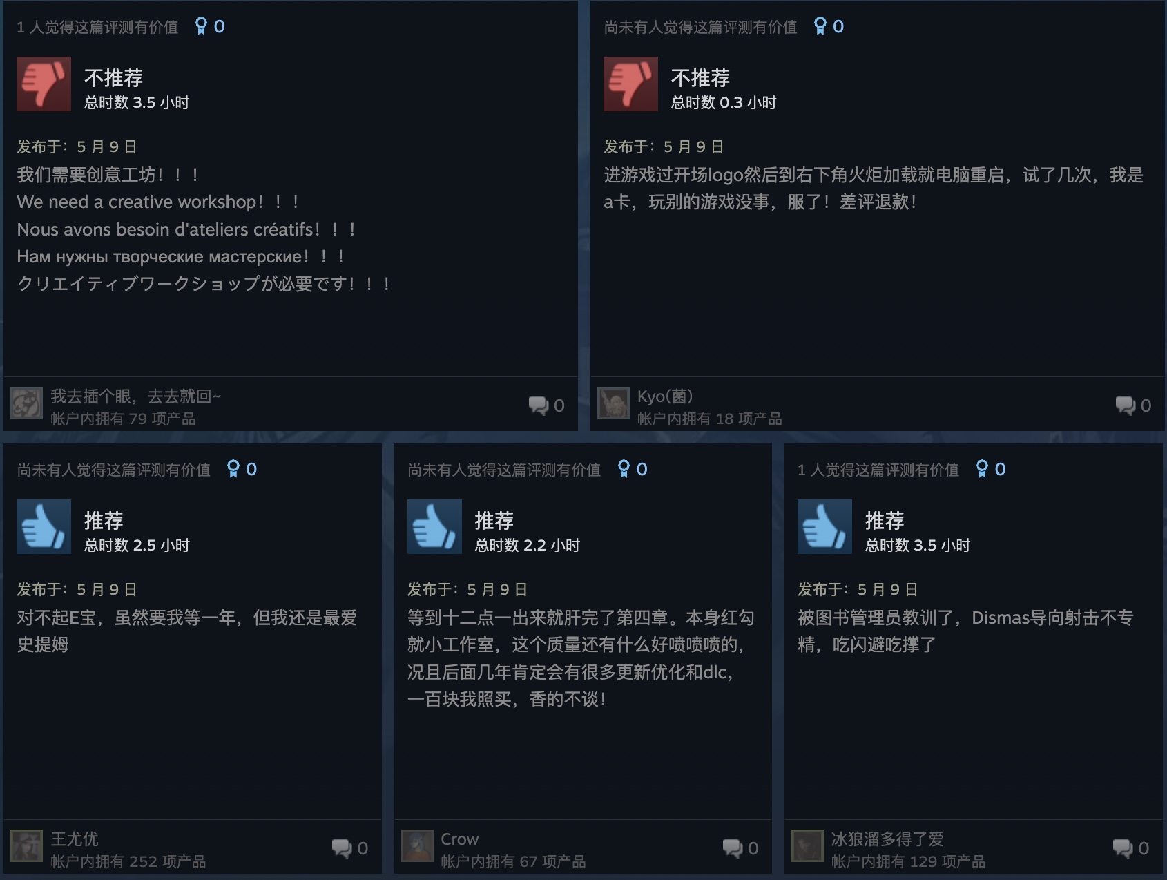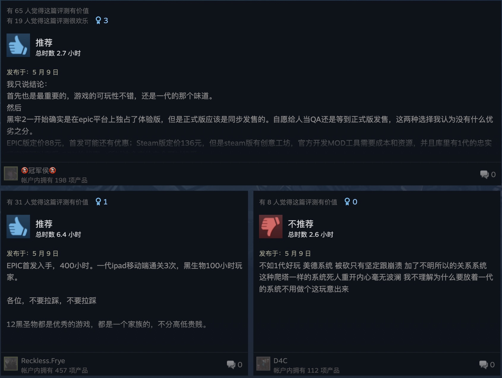 而本作的评论区也不缺乏一些批评的声音,比如一些玩家觉得和之前Epic平台的售价相比,Steam首发136元的价格显得比较昂贵。美德系统被砍等等,游戏的体验偏向爬塔。同时也有很多玩家吐槽本作汉化的水平拙劣,质量不高,同时汉化的字体也有些出戏。此外,还有很多玩家在进入游戏之后遇到崩溃和卡顿掉帧的问题,游戏的优化也有待进一步改进。目前游戏的创意工坊尚未开放。