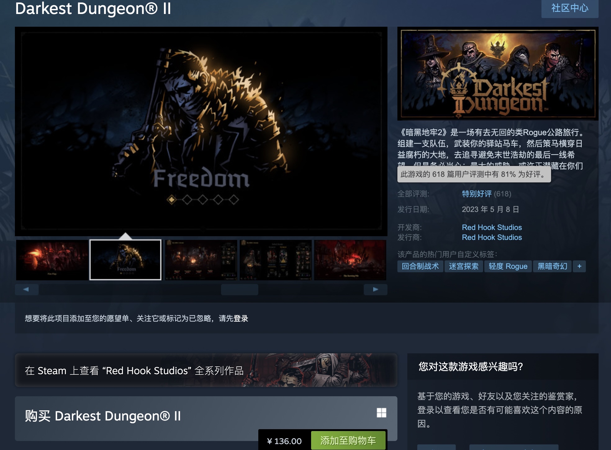《暗黑地牢2》国区首发价136元,整体评价特别好评
