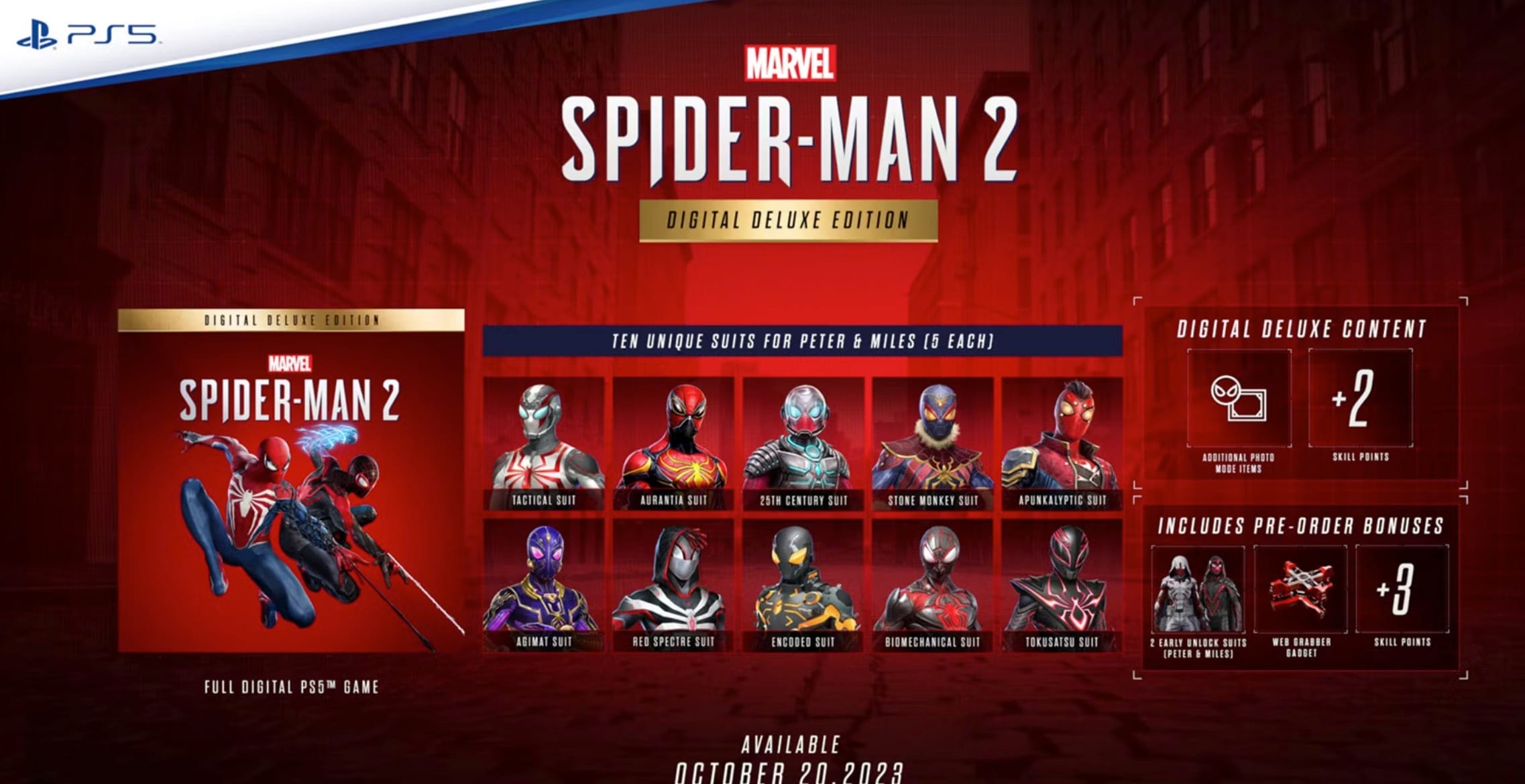 【《漫威蜘蛛侠 2》豪华版中10套战衣为豪华版独占,不会随游戏解锁】《漫威蜘蛛侠 2》数字豪华版附带了10种独特的服装,彼得·帕克和迈尔斯·莫拉莱斯各有五套。但Insomniac Games已确认,《漫威蜘蛛侠 2》数字豪华版中的服装无法通过游戏解锁。当然如果你购买的是典藏版,也可以获得这些服装以及19英寸的双蛛与毒液大战雕像和特制铁盒。《漫威蜘蛛侠 2》将于10月20日登陆PS5。