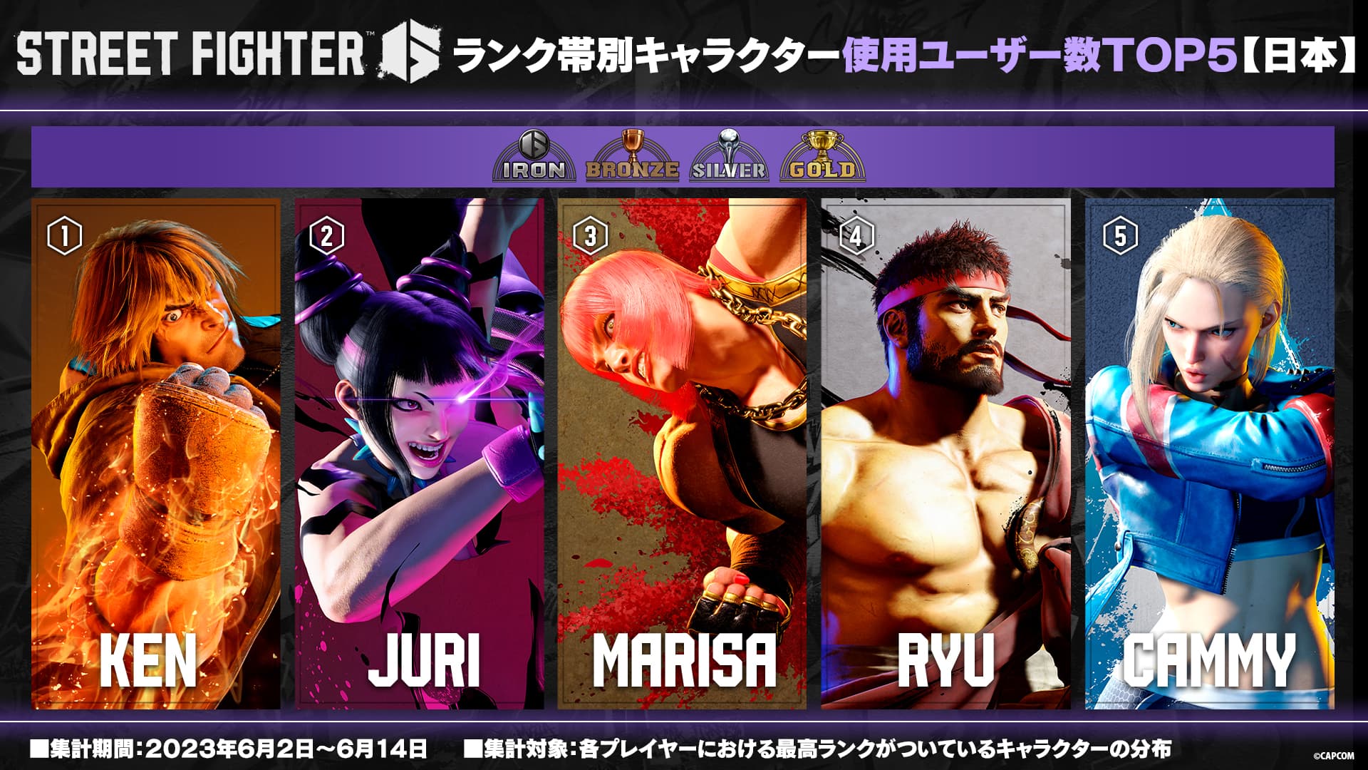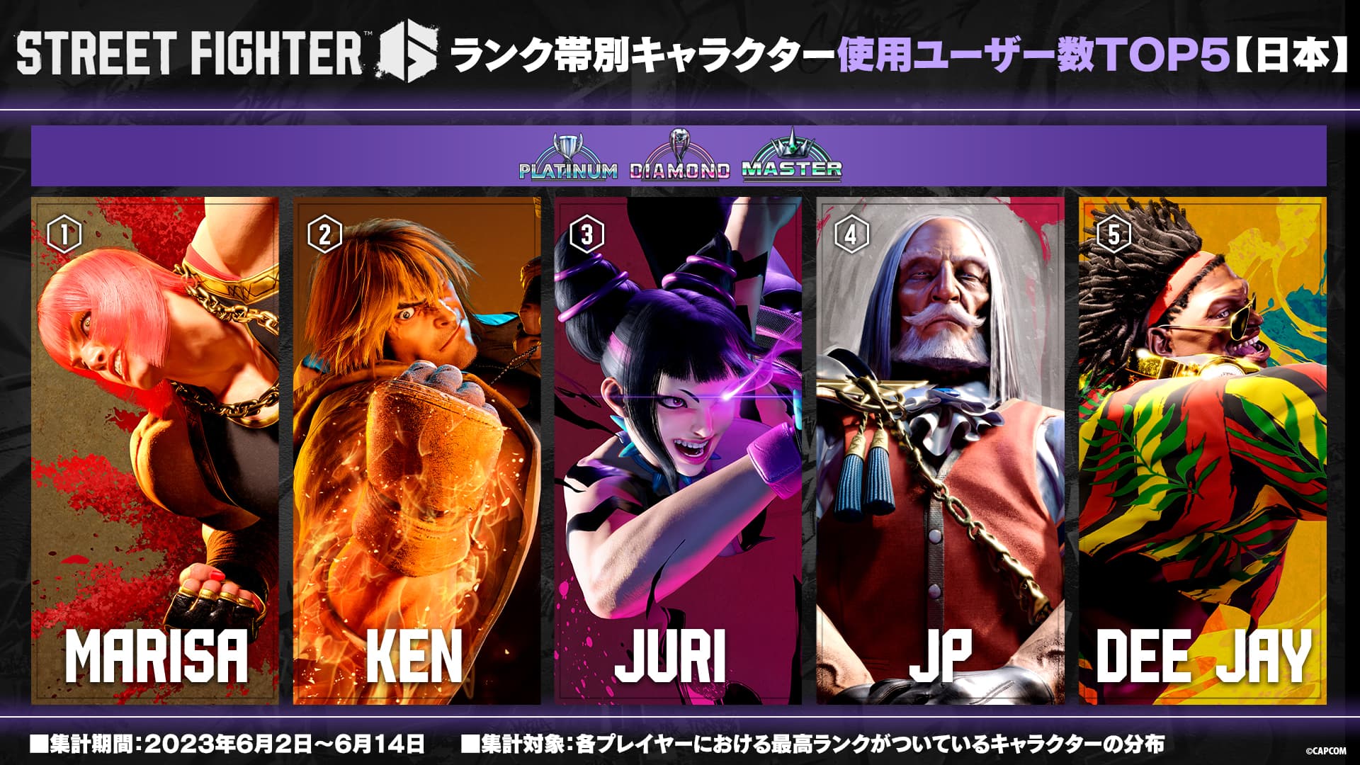 【Capcom公布《街头霸王6》天梯角色玩家使用数排名】Capocm今日公布了格斗新作《街头霸王6》目前天梯模式中角色的玩家使用数TOP5名单。此次数据来自日本地区,采集时间在6月2日~14日,以下为具体: 1、白金/钻石/大师分段:玛丽莎、肯、韩蛛俐、JP、迪·杰 2、铁/青铜/白银/黄金分段:肯、韩蛛俐、玛丽莎、隆、嘉米 3、新手:韩蛛俐、嘉米、肯、卢克、隆