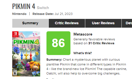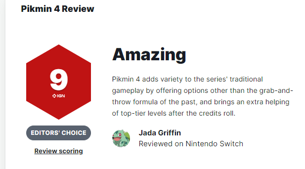 【《皮克敏4》获IGN9分、GS7分评价】任天堂新作《皮克敏4》全球媒体评测现已入炉,游戏目前MC上均分86(由31家媒体打出。作为对比,NGC上的《皮克敏2》均分为90、WIIU上的《皮克敏3》87、NS上的《皮克敏3:豪华版》85)。其中IGN为本作打出了9分,而Gamespot则给出了7分。