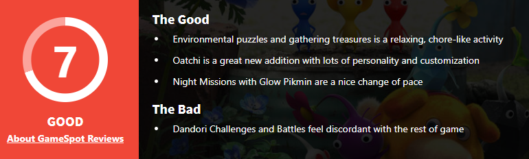 GS认为:《皮克敏4》是一款令人愉悦且可以轻松游玩的游戏,对于新人来说是个很好的入门作。环境谜题以及收集宝物都充满着乐趣,“欧庆”作为一个全新的要素也令人满意,并且它又具有着丰富个性和定制系统。夜光皮克敏的夜间任务也为游戏带来了一个非常人性化的节奏。不过“当多虑”挑战这个和游戏有些格格不入。