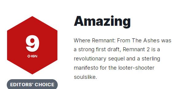 IGN评语:《遗迹2》是一部具有变革性的续作、类魂的Looter-Shooter佳作。它不仅将魂元素改造并融入此类射击游戏之中,并能在处处体现这一概念的同时添加更多的内容进去。游戏中精彩的战斗及BOSS战、由程序生成的关卡以及巧妙的多元概念设计使得本作可能成为我(评测人)今年最喜欢的作品之一。