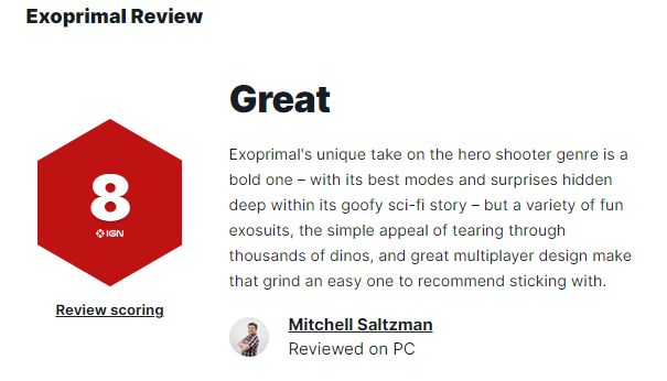 媒体IGN今日为游戏打出了8分评价,评测人员认为《原始袭变》是对英雄射击游戏类型的一种大胆尝试,随着游戏时长的增加会逐渐深入了解本作的精髓并体验到这其中的最佳核心要素。虽然重复刷刷刷的属性可能会让人感到厌烦,但其独特的PvPvE设计、各种有趣的动力装甲加上打恐龙的爽快玩法使得《原始袭变》仍是一款值得推荐的游戏。