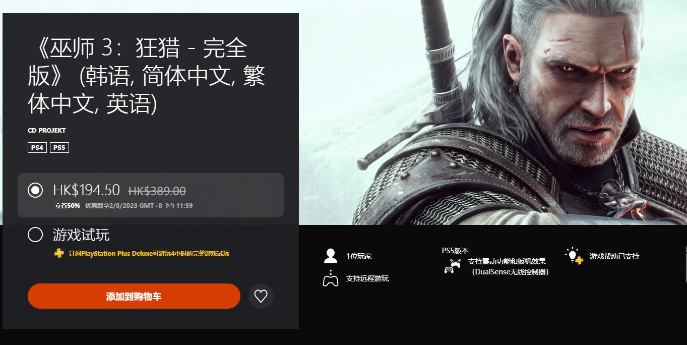 【《巫师3:狂猎》完全版进入PS+3档试玩目录】《巫师3:狂猎》完全版现已进入PS+3档游戏试玩目录,订阅了3档会员的玩家可以免费体验游戏4小时。《巫师3:狂猎》完全版包括游戏所有的DLC内容,PS5版于去年12月推出。