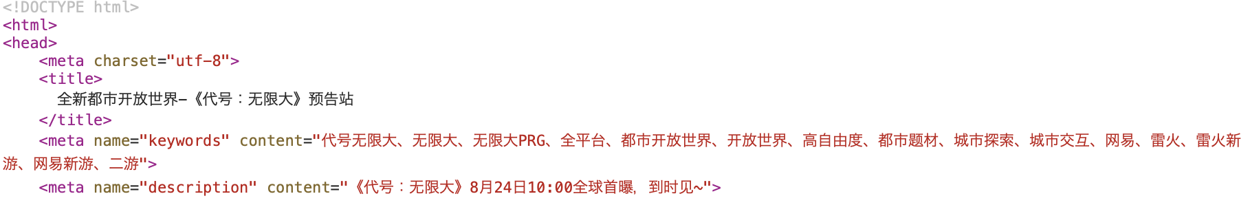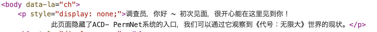从“可见”的部分,我们已经能做出如此多的猜想,那么,将这个网站抽丝剥茧,我们又能得到哪些新信息?通过查阅该网站的源代码,一些现在尚未公开的情报也浮出水面。其中不仅有 “代号无限大、无限大、无限大PRG、全平台、都市开放世界、开放世界、高自由度、都市题材、城市探索、城市交互、网易、雷火、雷火新游、网易新游、二游”这一对游戏的长串描述,更有“调查员,你好 ~ 初次见面,很开心能在这里见到你!