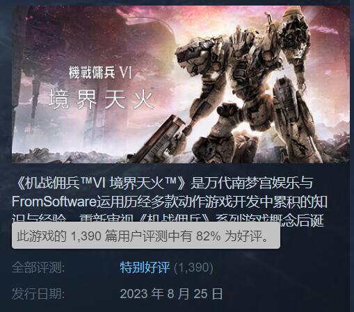 《装甲核心6》Steam玩家“特别好评”,差评原因多为闪退等优化问题