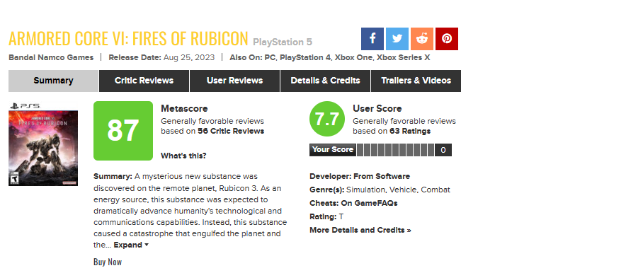【《装甲核心6》成为系列评分最高作品】《装甲核心6》自发售以来广受好评,今日,《装甲核心6》正式取代《装甲核心2》(MC评分78分),成为系列评分最高作品。截至目前《装甲核心6》Metacritic上获得56份评价,均分87分,在Steam上收获了超过11788份好评。 你入手本作了吗?欢迎为前往游戏详情页为本作留下您的评分与评价,您的评价对其他柄友来说非常重要哦!