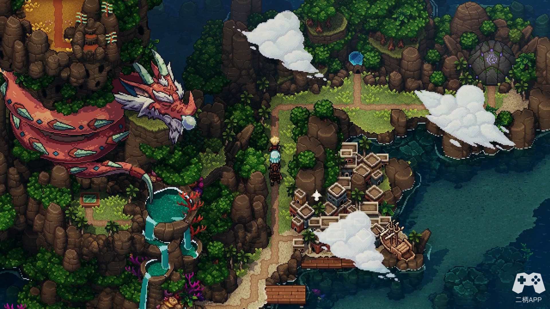 可是简单并不意味着难看,简单也可以做到精致。尽管《星之海》没有像SE的《八方旅人》系列那样投入高技术雕琢出一个2D-HD的世界,而是返璞归真尊重了传统像素风作品的画面表现,但它依然用精心刻画的设计,绘制了一个精致的游戏世界。无论是角色们在地图上呈现的像素小人形象,还是对话里展现的半身立绘,或是游戏地图里的潺潺细流,卷卷白云,都让游戏观感征服了玩家的眼球。技法或许会过时,但美丽的艺术本身永远不会褪色。再加上设置里最高可选的4K分辨率,以及让画面更为柔顺的完美像素选项,都令20年前的画风获得了进化。同时,跑图与明雷遇敌相结合,无缝切入战斗的设定,更让像素画风与游戏玩法浑然天成。如果说画面方面有什么瑕疵的话,那或许是游戏为数不多的过场CG所使用的截然不同的美式动画风格,相较于游戏本身的像素风而言略显粗糙。