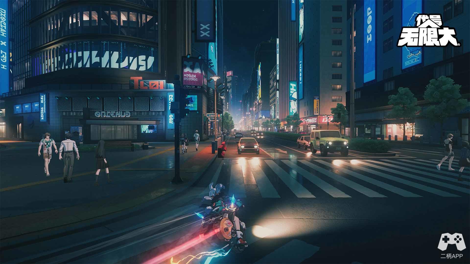 对此,《代号:无限大》有过之而无不及,这也是游戏被称为“二次元GTA”的一大原因。参考图中:两名角色骑着“小电驴”背着爆炸疾驰、雨夜驾驶汽车在车流中闪转腾挪……这种在都市中横冲直撞的自由感,正是都市开放世界带来的最大爽感之一。