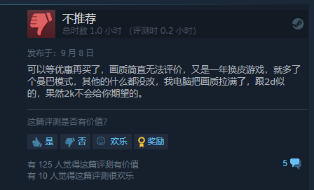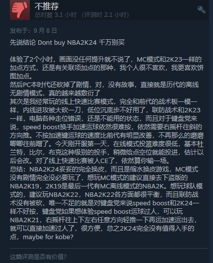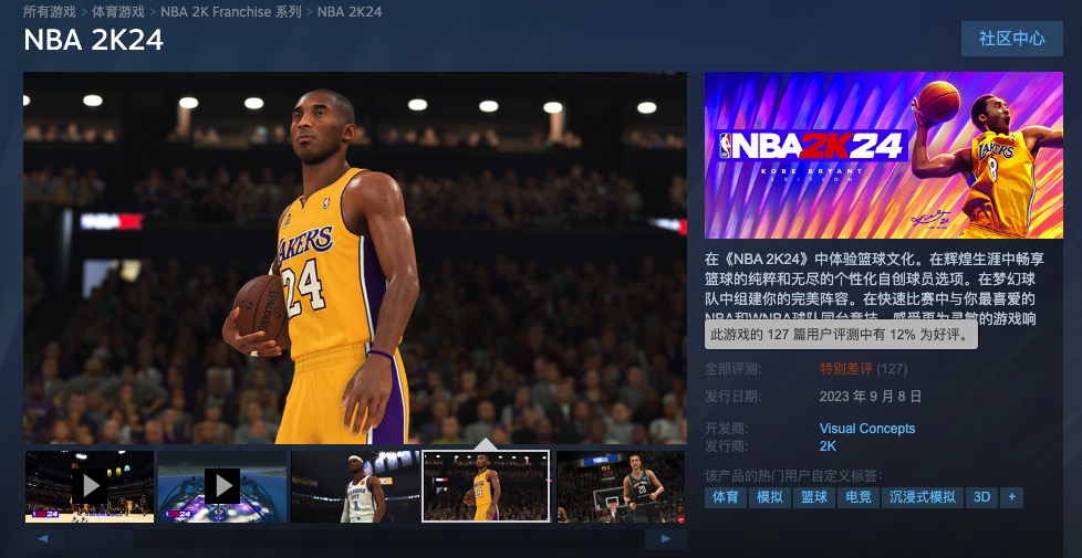 《NBA 2K24》今日正式发售,目前Steam上玩家好评率仅12%