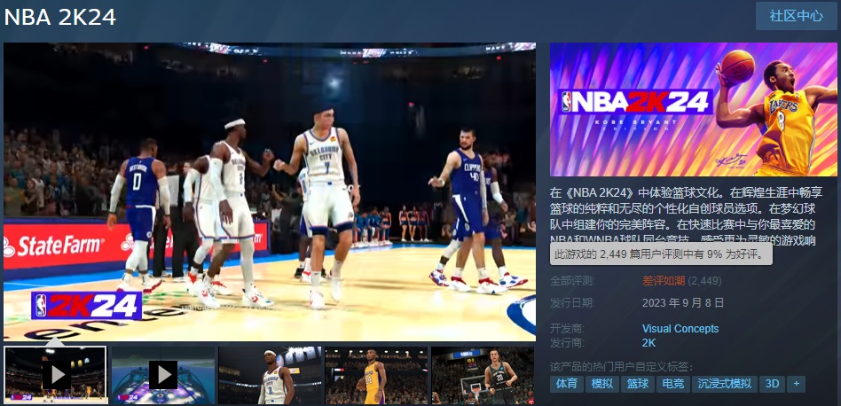 【《NBA:2K24》超越《三国杀》成为差评榜老二】于9月8日上市的《NBA:2K24》自登录Steam以来就备受玩家们诟病,在游戏首日上线时我们曾报道过本作好评率仅为12%(国区4%)。其中键盘映射、删减剧情,完全换皮的设计等问题遭到了粉丝们的口诛笔伐。现阶段《NBA:2K24》Steam玩家好评率已经降到9%(国区2%),根据实时监测该平台用户评论数的steam250统计数据显示,本作已超越《三国杀》成为差评榜老二。虽然评论数还比不上差评排行榜第一位“终极差评王《守望先锋2》”,不过截至目前两位高手在Steam页面上的好评率还是平分秋色的(但国区3%的好评率照比《NBA:2K24》略逊一筹)。