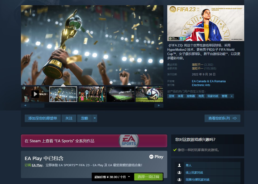 【EA已下架所有《FIFA》系列游戏】众所周知,从今年开始,EA将不再使用《FIFA》这个名字来作为其标志性的足球游戏命名,而是改为了《FC 24》。据悉,EA目前已经从各主要数字平台下架所有《FIFA》系列命名的游戏,新玩家已无法购买,已经购买游戏的玩家不受影响。其他玩家可以通过EA Play来游玩《FIFA22》和《FIFA23》。新的《FC 24》将于今日正式发售,登陆PS5、PS4、Xbox One、Xbox Series X/S、Switch、PC平台。