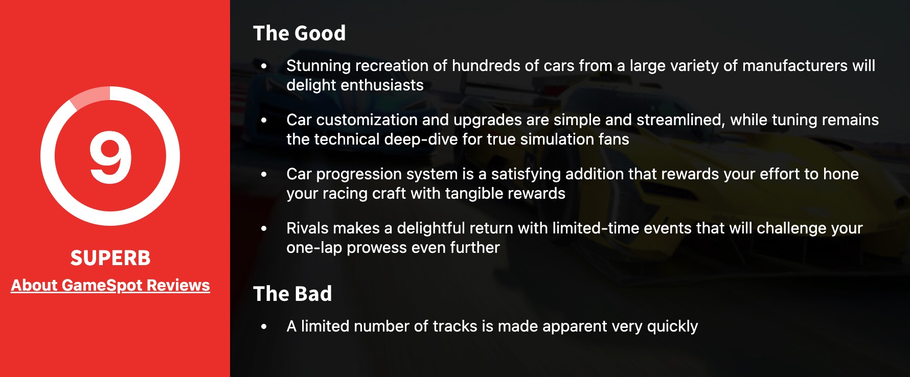 GS:精美再现了来自各种制造商的数百款汽车,让汽车发烧友为之兴奋。车辆的定制和升级简单顺畅,升级系统是一个令人满意的新功能,通过有形的奖励来让玩家磨练技巧时更有动力。竞争对手模式的回归也令人感到愉快,限时赛事将进一步挑战车手的单圈速度。但游戏中的赛道数量有限,甚至不到《极限竞速7》最终所拥有的一半。