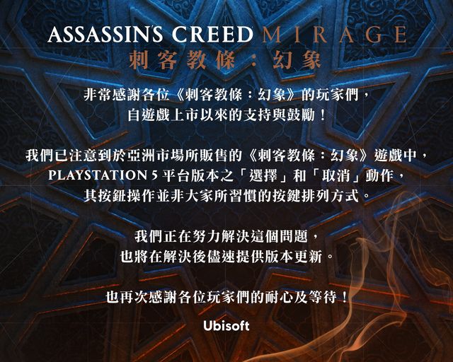 育碧官方发布公告称已经知晓亚洲地区PS5版本的《刺客信条:幻景》的OX按键功能与PS5默认确认取消的按键方式不同,目前正在解决并后续通过更新修复。