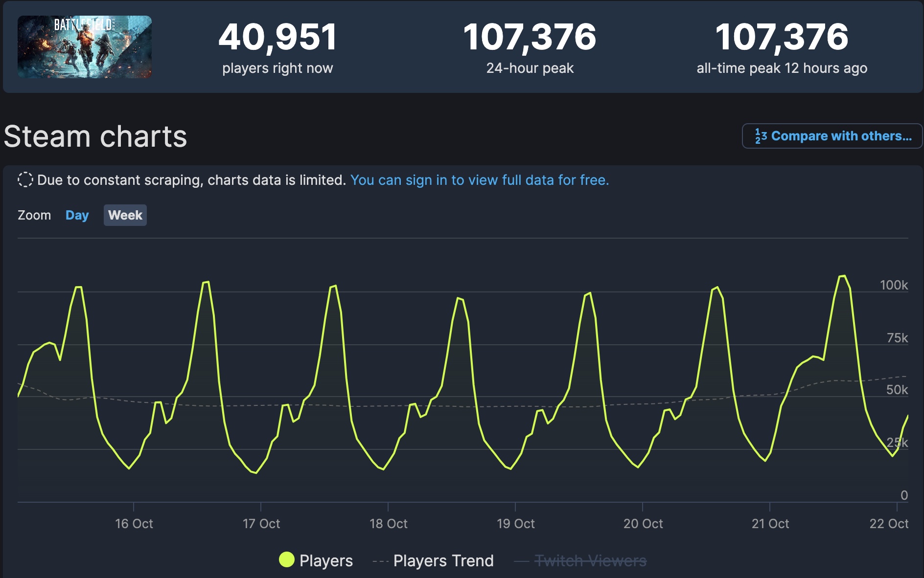 《战地2042》Steam在线人数打破发售记录,达到107,376人