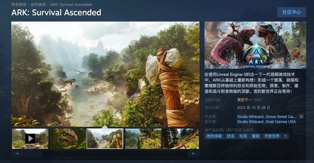 《方舟:生存上升》现已登录Steam,目前获评“褒贬不一”