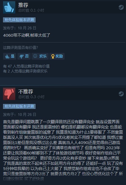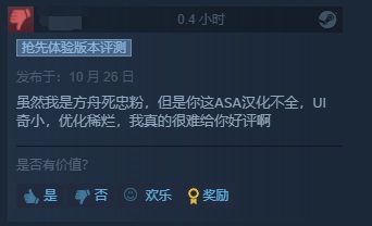 【《方舟:生存上升》现已登录Steam,目前获评“褒贬不一”】使用虚幻5所打造的《方舟:生存上升》现已在Steam上开启了抢先体验,本作重新构思了ARK的艺术设计和游戏世界,利用新引擎的技术带来了全新的物理系统以及极致的细节。截至目前,该平台上已有608篇玩家评测,好评率43%,其中国区94份,好评率仅有19%。大多数玩家不满的点在于游戏的优化非常之差,卡顿现象严重,高配置下帧数也很低且不稳定。不仅如此,游戏在本地化上的问题也十分大,不少地方都没有翻译完全。《方舟:生存上升》Steam国区售价165元,目前处于首发优惠阶段,九折后148.5元,截止时间为11月2日。