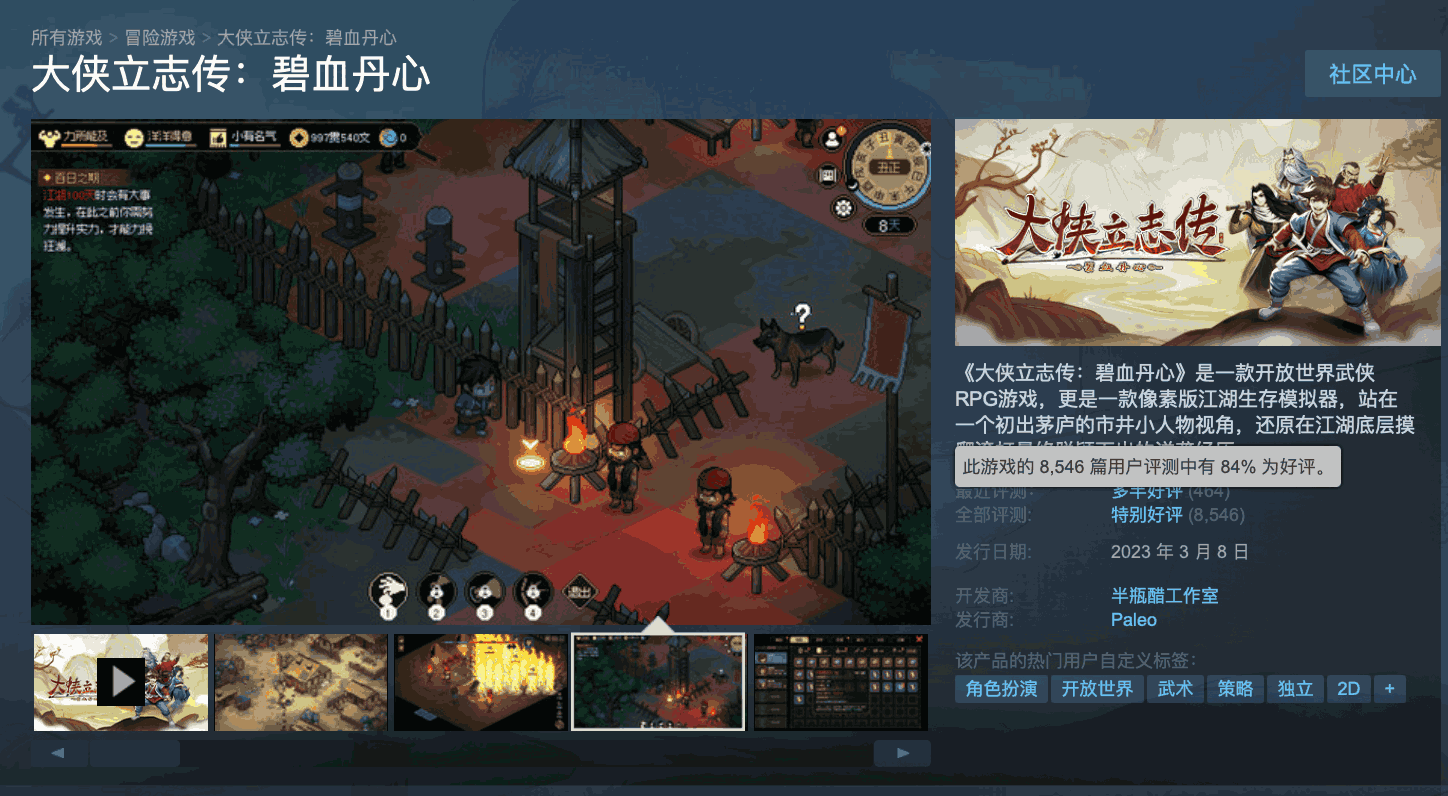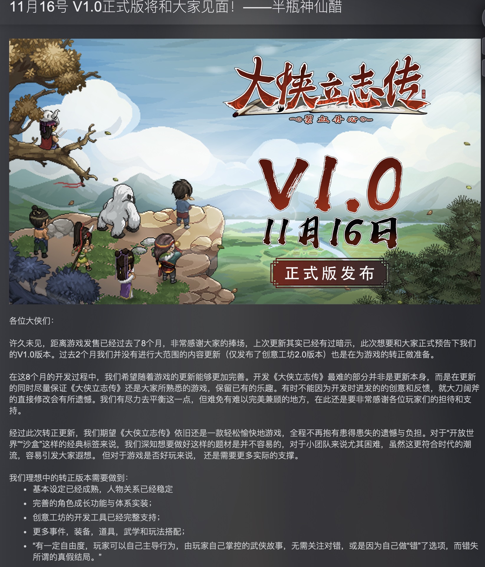 【开放世界武侠RPG《大侠立志传:碧血丹心》将于11月16日迎来正式版上线】由半瓶醋工作室所开发的独立游戏《大侠立志传:碧血丹心》于今年3月在Steam开启了EA抢先体验。官方今日宣布,在经过了8个月的更新和制作后,游戏将于11月16日上线V1.0正式版。本作是一款开放世界武侠RPG,同时也是一个像素版“江湖生存模拟器”,玩家将在其中扮演一个初出茅庐的市井小人物,在江湖中摸爬滚打、体验多样身份,最终脱颖而出。在EA期间游戏进行了大量内容的更新与修复,包括新门派、新剧情、创意工坊等。此次的正式版还会囊括家园玩法,大量新增事件、比武玩法以及江湖历练功能等内容。同时还将兼容玩家们一直建议的手柄支持与Steam Deck适配。《大侠立志传:碧血丹心》国区售价69元,目前获玩家“特别好评”。