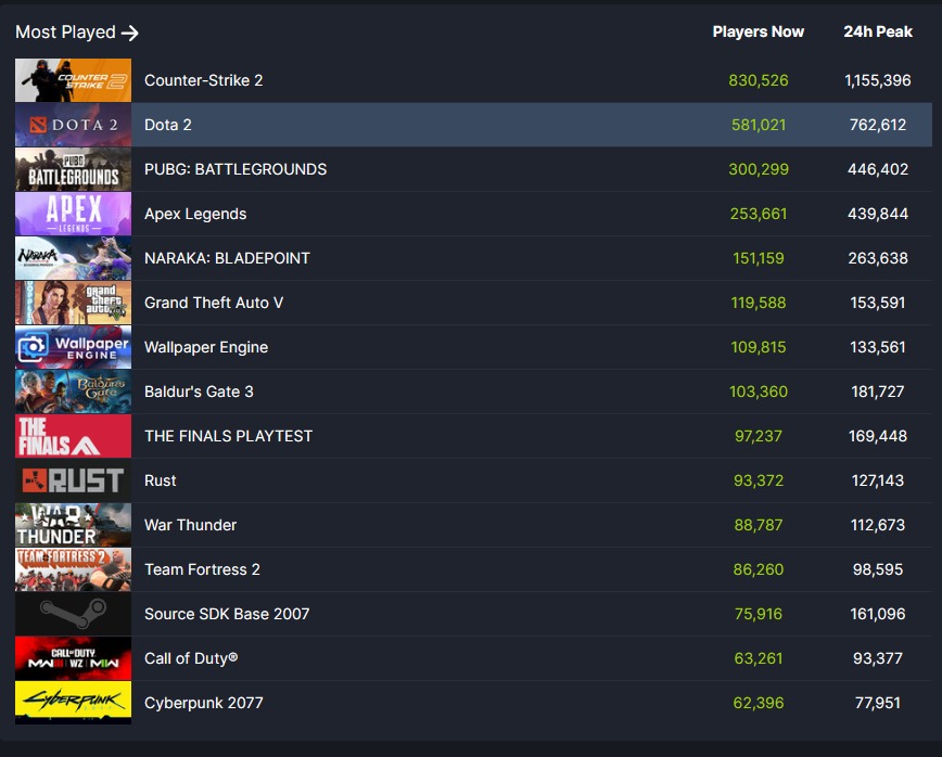 【《COD:现代战争3》冲至Steam全球销售榜第二位】在前几日,预定了数字版《COD:现代战争3》的玩家已经开始了本作的单人战役。虽然因流程过短等问题,本作的口碑欠佳。但这似乎并不能阻止玩家们强烈的购买欲望,目前《COD :现代战争3》已经冲到了Steam全球热销榜的第二名,仅次于《CS2》。从SteamDB上的数据来看,在线玩家数为63261人,排在第14名。