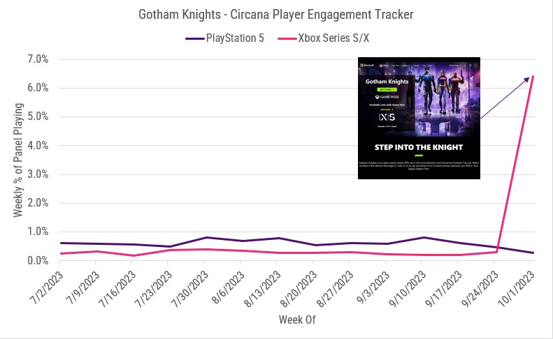 【《哥谭骑士》加入Xbox Game Pass后玩家人数提升明显】《哥谭骑士》上市时并未获得玩家们的认可,但根据动视和华纳游戏前高管Mat Piscatella提供的数据显示,当游戏加入Xbox Game Pass后,玩家数量有了大幅的增长。作为对比,当《哥谭骑士》被添加到PlayStation Plus时,玩家数量的提升并没有达到Xbox Game Pass的高度。随着时间推移,两个平台玩家人数都在下降,并逐渐接近。有玩家指出,虽然Xbox Game Pass吸引的玩家数量是PlayStation Plus的两倍,但PlayStation用户在游戏中的时间更长。