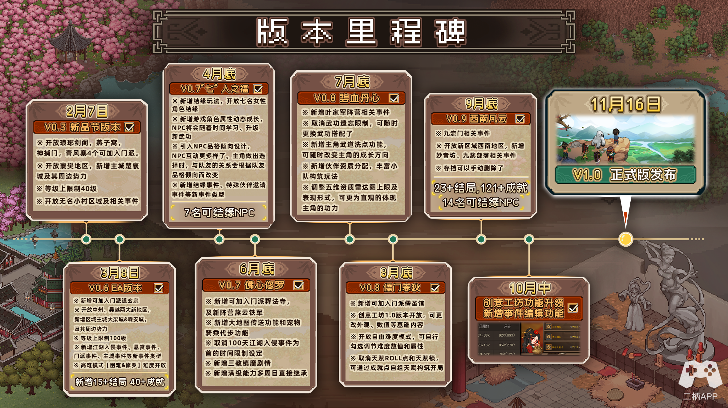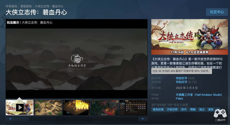 今年3月,由“醋仙”——半瓶神仙醋开发的独立游戏《大侠立志传:碧血丹心》曾开启了EA抢先体验,前不久工作室宣布,将会在今年11月16日 发布游戏的V1.0正式版。