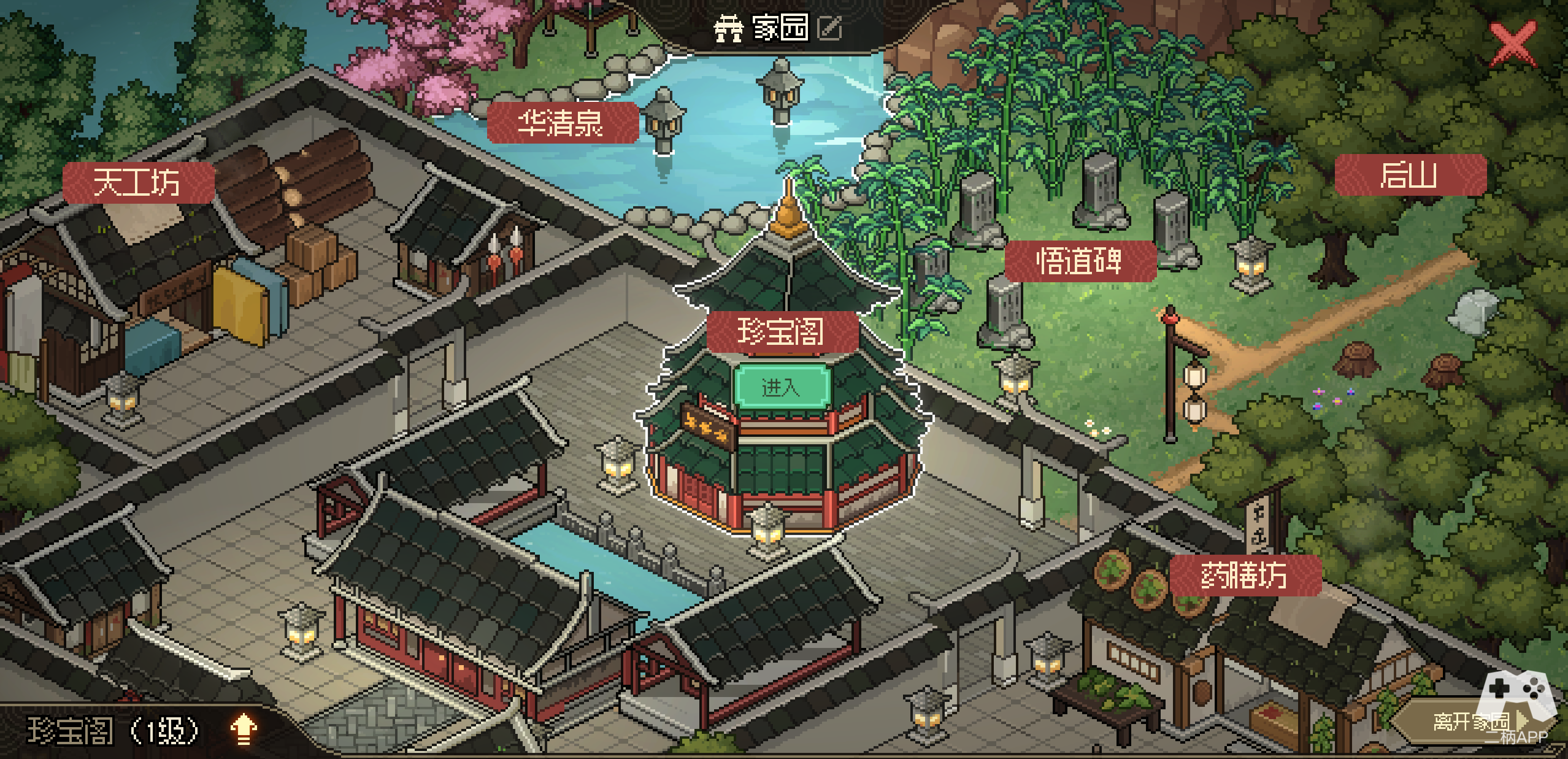 家园系统可以认为是一个为终局游戏和多周目量身订做的系统,在其中你可以建造和升级天工坊、华清泉、珍宝阁、悟道碑、药膳坊等设施,其中可以制造衣服和打造兵器的天工坊需要无名村的王大锤在队内方可开启,负责制药和做饭的药膳坊则是需要无名村的白头翁,这某种程度上也算是一种游戏历程上的有始有终——因为后来我们能结交的队友往往在战力方面更加出色,但是最初的队友也能在游戏的末期给我们带来巨大的帮助。