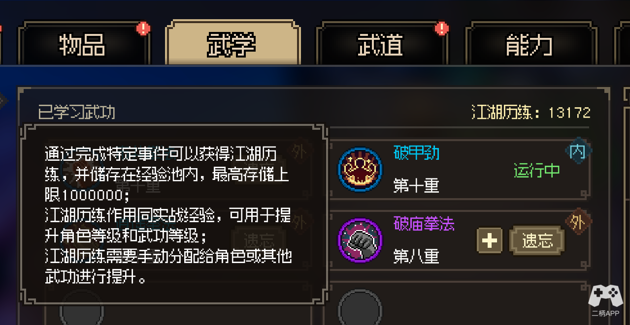 1.0版本的另一项重要改动是“江湖历练”,通过事件、悬赏、比武等途径可以获得江湖历练,用于提升指定角色的武功等级或者角色等级。
