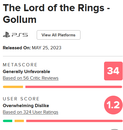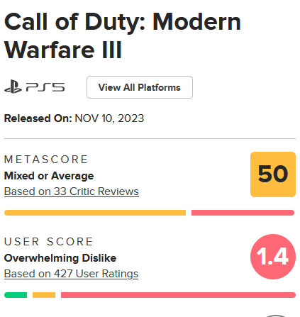【“年度最烂竞争激烈”《COD:MW3》MC用户评分仅1.4,媒体评价系列最差】《COD:MW3》已于上市,截至目前,游戏在MC上PS5版(其他平台未出分)均分为50,由33家媒体给出,用户平均分仅有1.4。虽然比年度大(烂)作《魔戒:咕噜》(媒体均分34/用户均分1.2),《骷髅岛:金刚崛起》(媒体均分23/用户均分3.6)略胜一筹,但作为被全球玩家所期待的一个大IP来说还是令许多粉丝倍感失望。