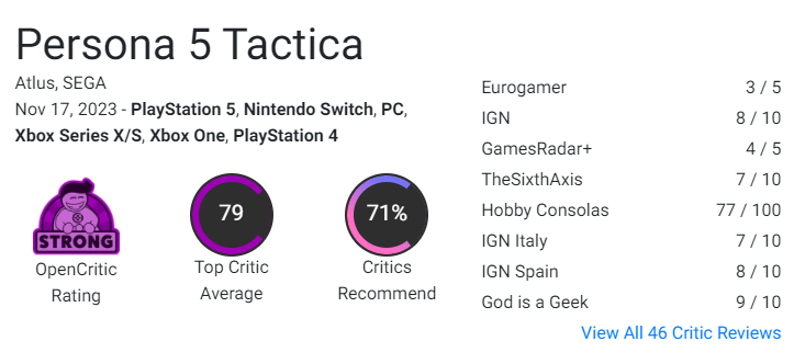 【《女神异闻录5:战略版》MC均分78,获IGN和GS双8分评价】由ATLUS带来的人气游戏《女神异闻录5》衍生作《女神异闻录5:战略版》全球媒体评测现已解禁。目前本作在MC上的媒体均分PC版77(由13家媒体打出)、Xbox版77(由16家媒体打出)、NS版78(由21家媒体打出)、PS5版78(由15家媒体打出),opencritic79分(现收录46家媒体),其中IGN和GameSpot双双给出了8分评价。