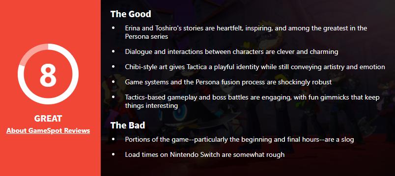 GS:新角色的故事令人印象深刻,可以说是是《女神异闻录》系列中最优秀的剧情之一;人物之间的对话和互动设计的也很巧妙;Q版的艺术风格别有一番风味;游戏的系统和战棋玩法(包括BOSS战)都令人满意,总的来说,它虽不及本篇,但也很优秀,尽管是衍生作,同样有着属于自己的美!缺点是游戏开头和最后几个小时很拖,需要忍耐,并且NS版偶尔会掉帧、加载时间也有点长。